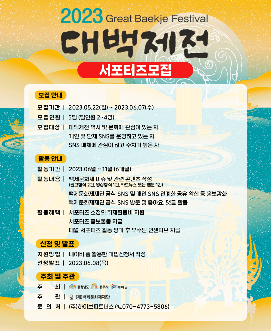 📢2023 대백제전 서포터즈모집📢 2023 대백제전과 함께할 서포터즈를 모집합니다! 대백제전역사 및 문화에 관심있는 분, 콘텐츠 제작을 좋아하시는 분 지원해주세요!🙋 ⭐모집안내⭐ ✅모집기간 : 2023.05.22(월)\~06.07(수) ✅모집인원 : 5팀 (팀인원 2\~4명) ✅모집대상 ①대백제전 역사 및 문화에 관심이 있는자 ②개인 및 단체 SNS를 운영하고 있는 자 ③SNS 매체에 관심이 많고 수치가 높은 자 ⭐활동안내⭐ ✅활동기간 : 2023.06월 \~ 11월 (6개월) ✅활동내용 ①백제문화제 이슈 및 관련 콘텐츠 작성(원고형식 2건, 영상형식 1건, 카드뉴스 또는 웹툰 1건) ②백제문화제재단 공식 SNS 및 개인 SNS 연계한 공유 확산 등 홍보강화 ③백제문화제재단 공식 SNS 방문 및 좋아요, 댓글 활동 ✅활동혜택 서포터즈 소정의 취재활동비 지원 서포터즈 홍보물품 지급 매월 서포터즈 활동 평가 후 우수팀 인센티브 지급 ⭐신청 및 발표⭐ ✅지원방법 : 네이버 폼 활용한 가입신청서 작성 ✅선정발표 : 2023.06.08(목) 신청하러가기 > https://naver.me/FsKmmr6E