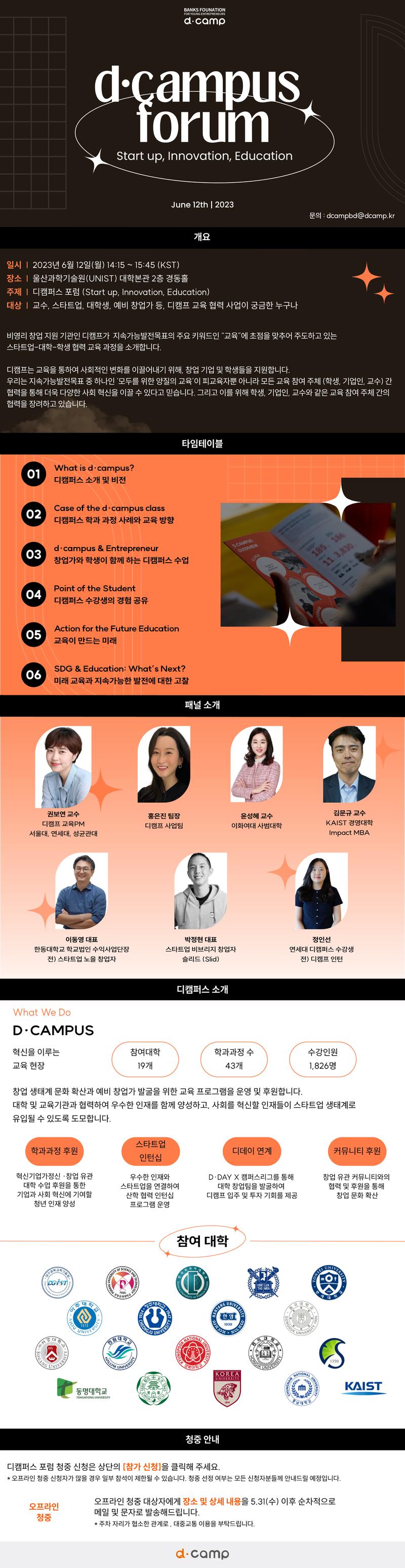 [2023 디캠퍼스 포럼 행사 개요] ▶일시 : 2023년 6월 12일(월) 14:15 \~ 15:45 ▶장소 : 울산과학기술원(UNIST) 대학본관 2층 경동홀 ▶주제 : 디캠퍼스 포럼(Start up, Innovation, Education) ▶청중 모집 기한 : 2023년 6월 8일(목) 17시까지 ▶신청 링크: https://dcamp.kr/event/45898