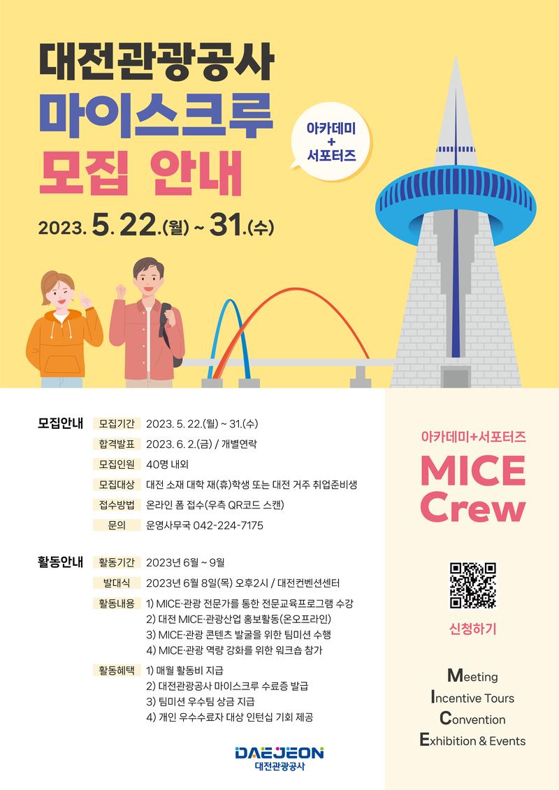 ○ 모집개요 - 대전관광공사에서는 대전 MICE·관광 산업 분야 전문인력 양성과 대전 MICE·관광 산업 홍보를 위해 "대전관광공사 마이스크루(MICE Crew)"를 운영하고자 하오니 관심있는 분들의 많은 참여 바랍니다.