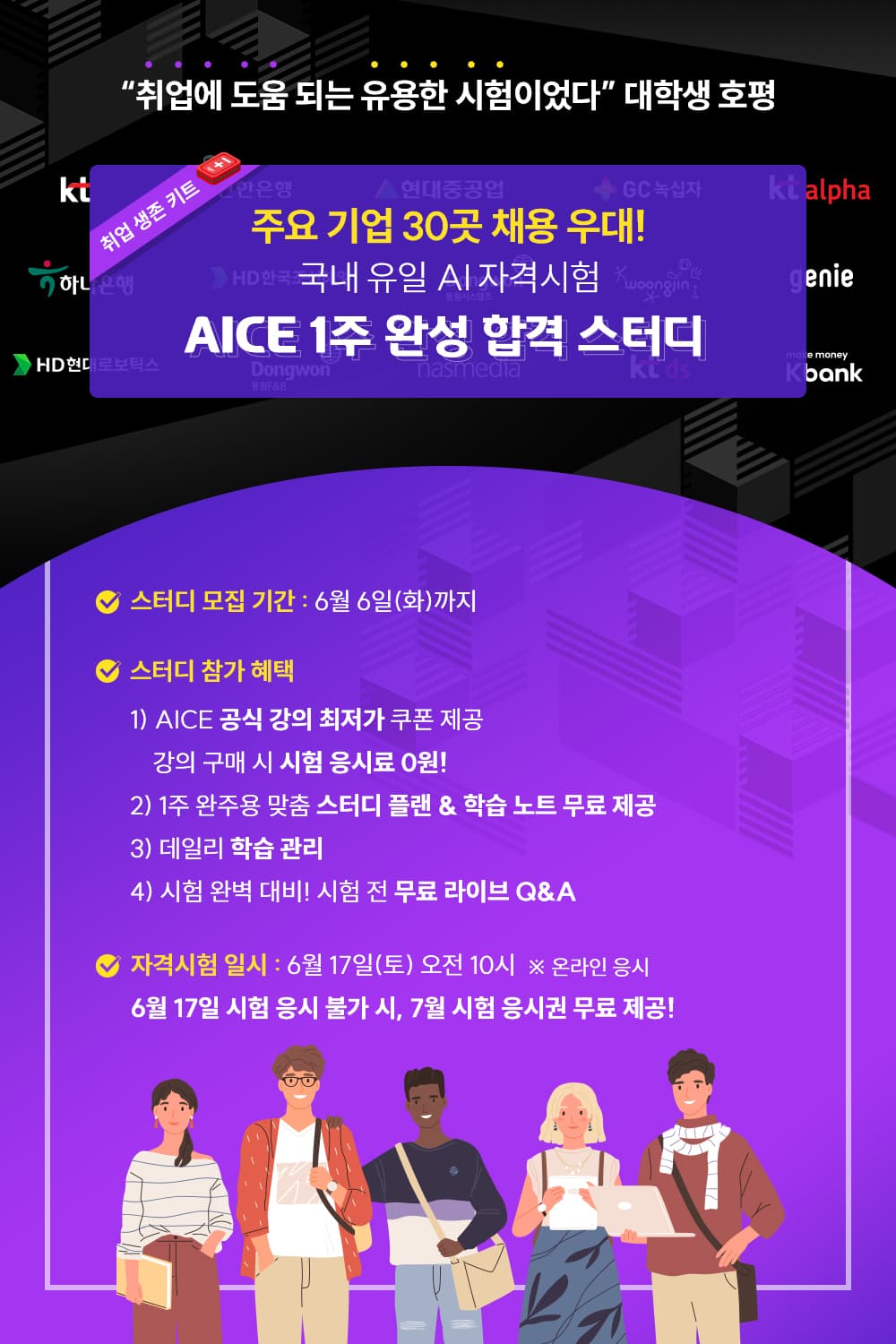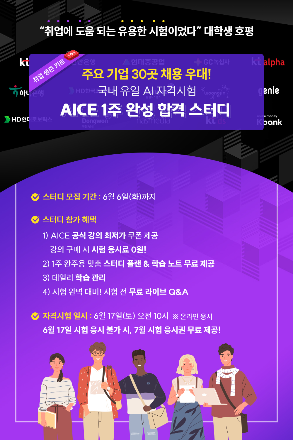 ChatGPT가 앞당긴 AI 시대, 이제는 AI 활용 능력이 취업 생존 전략! 여러분의 AI 경쟁력을 입증할 수 있는 국내 유일 AI 자격시험 AICE를 하루 2시간, 단 1주일 만에 완성할 수 있는 스터디를 소개합니다.