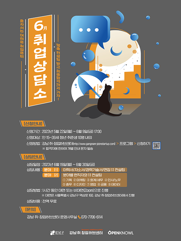 [상담안내] 🟧상담일정 : 2023년 6월 19일(월) \~ 6월 30일(금) 🟧상담내용 : 분야 [1] 이력서/자소서/경력기술서/면접 1:1 컨설팅 분야 [2] 분야별 현직자와 1:1 컨설팅 ①기획 ②마케팅 ③회계/세무 ④인사/노무 ⑤총무 ⑥디자인 ⑦영업 ⑧금융 ⑨데이터 🟧상담방법 : 1시간 동안 대면 또는 비대면(Zoom)으로 진행 ※ 대면은 서울특별시 강남구 역삼로 160, 강남 취•창업허브센터에서 진행 🟧상담비용 : 전액 무료 [신청안내] 🟧신청기간 : 2023년 5월 22일(월) \~ 6월 9일(금) 17:00 🟧신청대상 : 만 15\~39세 청년 취준생 10명 내외 🟧신청방법 : 강남취창업허브센터(http://www.gangnam-jobnstartup.com/) > 프로그램 > 신청하기 ※ 자세한 내용은 홈페이지를 통해 확인 바랍니다. [참여혜택] 🟧공간대관: 강남취창업허브센터 스터디룸 당일 또는 1일전 예약권 (1회) ※ 예약 현황에 따라 변동 될 수 있습니다. 🟧취업 정보: 카카오 플러스 친구를 통해 강남 취•창업허브센터 프로그램 정보 제공 🟧음료제공: 강남 취•창업허브센터 무료 음료 쿠폰 제공 (1회)