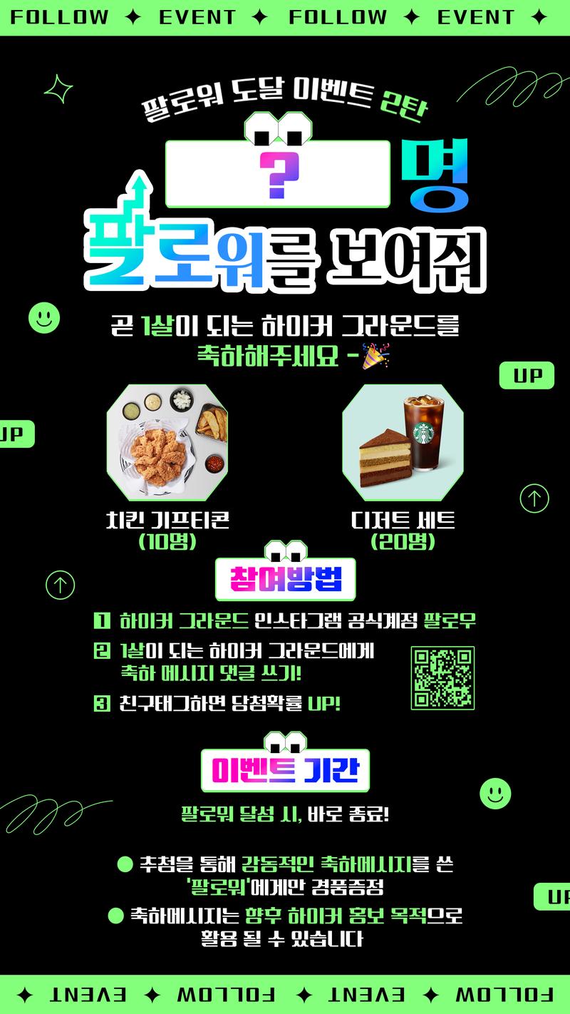 ※ 하이커 ‘팔로워’에게만 추첨을 통해 경품 증정! ※ 팔로워가 아닐 시, 당첨이 취소 됩니다 ※ 축하메시지는 향후 하이커 홍보 목적으로 활용 될 수 있습니다