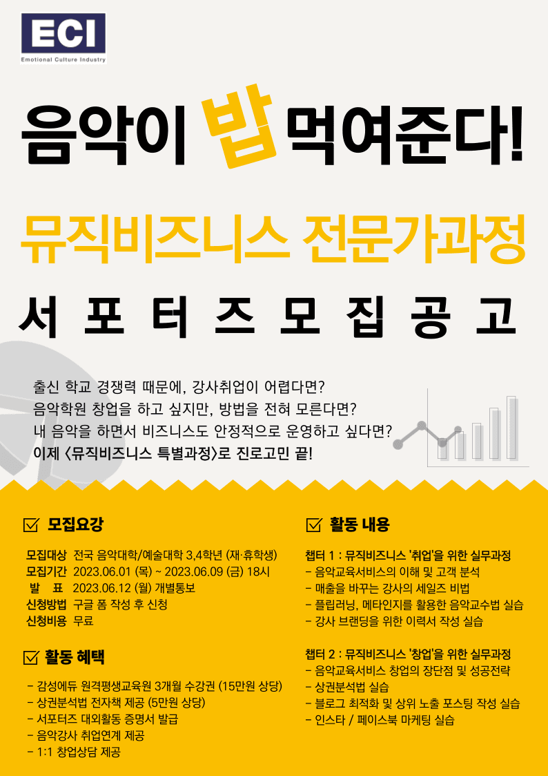 ○ 활동내용 - 챕터 1 : 뮤직비즈니스 '취업'을 위한 실무과정 음악교육서비스의 이해 및 고객 분석 매출을 바꾸는 강사의 세일즈 비법 플립러닝, 메타인지를 활용한 음악교수법 실습 강사 브랜딩을 위한 이력서 작성 실습 - 챕터 2 : 뮤직비즈니스 '창업'을 위한 실무과정 음악교육서비스 창업의 장단점 및 성공전략 상권분석법 실습 블로그 최적화 및 상위 노출 포스팅 작성 실습