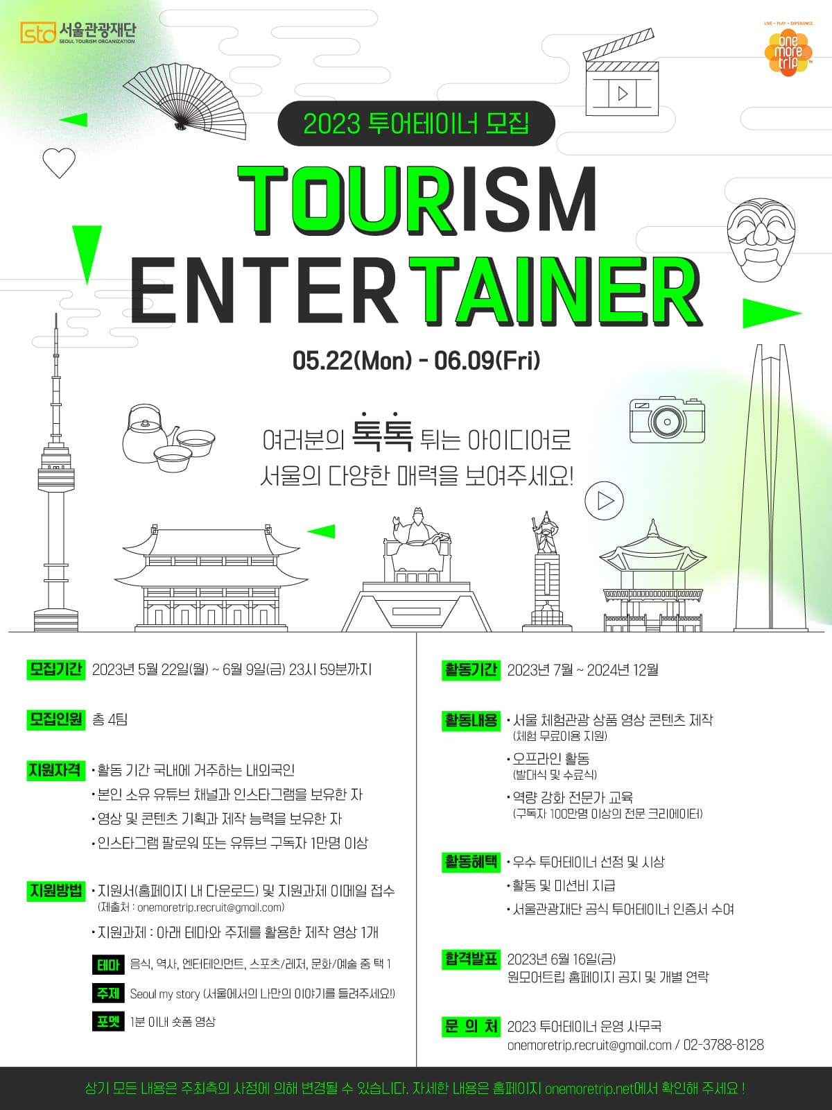 서울관광재단에서 서울 체험관광 전문 크리에이터로서 활동할 "2023 투어테이너"를 모집합니다. ⭐여러분의 톡톡튀는 아이디어로 서울의 다양한 매력을 보여주세요!⭐ ○ 모집 기간 2023년 5월 22일(월) \~ 6월 9일(금) 23시 59분까지 ○ 모집 인원 총 4팀 ○ 지원 자격 - 활동 기간 국내에 거주하는 내외국인 - 본인 소유 유튜브 채널과 인스타그램을 보유한 자 - 영상 및 콘텐츠 기획과 제작 능력을 보유한 자 - 인스타그램 팔로워 또는 유튜브 구독자 1만명 이상 ○ 지원 방법 - 지원서(홈페이지 내 다운로드) 및 지원 과제 이메일 접수 (제출 : onemoretrip.recruit@gmail.com) - 지원과제 : 아래 테마와 주제를 활용한 제작 영상 1개 *테마 : 음식, 역사, 엔터테인먼트, 스포츠/레저, 문화/예술 중 택1 *주제 : Seoul my story (서울에서의 나만의 이야기를 들려주세요!) *포맷 : 1분 이내 숏폼 영상 ○ 활동 기간 2023년 7월 \~ 2024년 12월 ○ 활동 내용 - 서울 체험관광 상품 영상 콘텐츠 제작 (체험 무료이용 지원) - 오프라인 활동 (발대식 및 수료식) - 역량 강화 전문가 교육 (구독자 100만명 이상의 전문 크리에이터) ○ 활동 혜택 - 우수 투어테이너 선정 및 시상 - 활동 및 미션비 지급 - 서울관광재단 공식 투어테이너 인증서 수여 ○ 합격 발표 - 2023년 6월 16일(금) - 원모어트립 홈페이지 공지 및 개별 연락 ○ 유의사항 - ‘2023 투어테이너 모집'은 내부 기준 및 심사를 통해 진행될 예정이며 심사 관련 사항은 공개하지 않음 - 모집 접수를 위한 영상 접수 등에 관한 소요비용은 신청자 부담이며, 출품된 모집영상은 반환되지 않음 - 과제영상이 모방 및 표절 등 타인의 지적재산권을 침해한 경우, 합격이 취소될 수 있음 ○ 문의처 2023 투어테이너 운영 사무국 onemoretrip.recruit@gmail.com / 02-3788-8128 ※상기 모든 내용은 주최측의 사정에 의해 변경될 수 있습니다. 자세한 내용은 홈페이지 (onemoretrip.net)에서 확인해 주세요!
