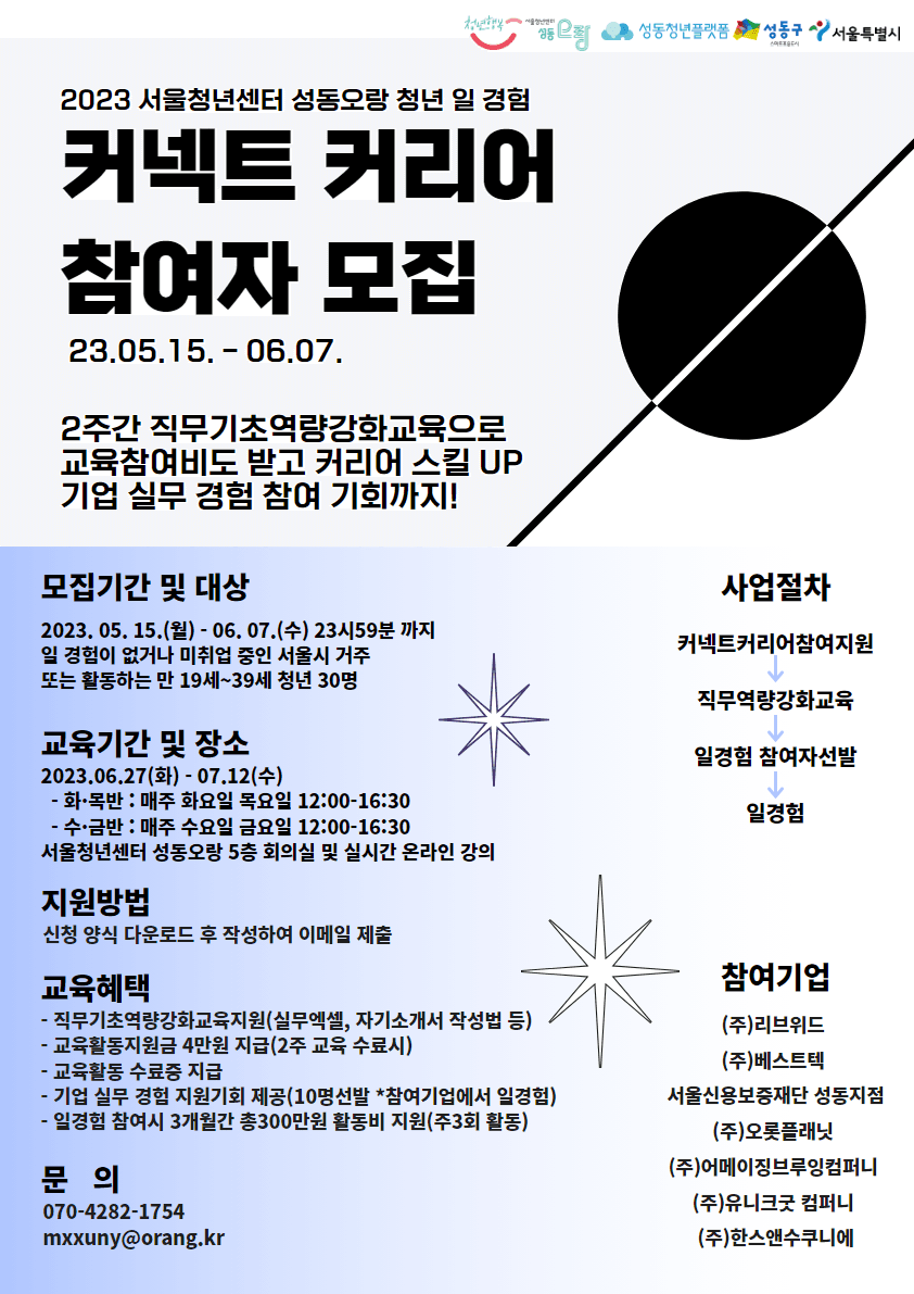 서울청년센터 성동오랑은 청년의 일 경험과 사회진출에 필요한 실무능력 양성을 통해 직무 역량 강화와 일자리 창출에 기여하고자 <커넥트 커리어> 청년 일 경험 사업 참여자를 아래와 같이 모집합니다.