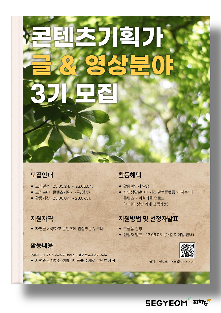 ■ 모집 분야 - 글 & 영상 ■ 기간 및 일정 - 접수 기간 : 23.05.24. \~ 23.06.04. - 선정자 발표 : 23.06.05. (선정자 이메일 안내, 전체결과 리치농 홈페이지 내 게시) - 활동 기간 : 23.06.07. \~ 23.07.31. ■ 선정자 오리엔테이션 일정 - 일자 : 23.06.07. 14:00 - 장소 : 온라인 플랫폼(zoom) ■ 활동내용 - 우리 집 근처 공원관리자부터 농어촌 체험장 운영자 인터뷰까지 ‘자연과 함께하는 생활 가이드’를 주제로 콘텐츠 제작 ■ 활동혜택 - 활동사실 확인서 발급 - 자연생활 분야 매거진 발행 플랫폼 ‘리치농’ 내 콘텐츠 기획결과물 업로드 (에디터 성함 기재 가능) - 2023년도 전속 에디터 팀원으로 활동 가능