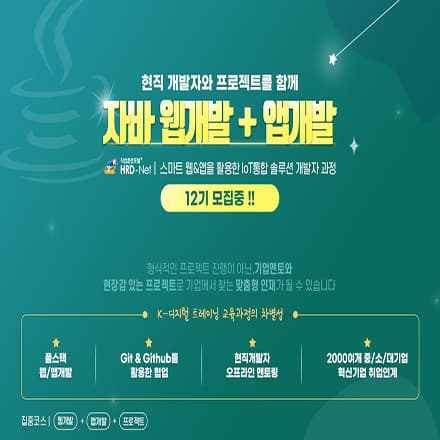[에이콘아카데미] 훈련과정 : [K-Digital] 현직 개발자와 함께하는 JAVA기반 풀스텍 웹 & 앱 개발자 과정 훈련자격 : 전공무관. 취업준비생.졸업예정자.취업성공패키지참여자.재학생(방통대,야간대) 교육일정 : 2023. 06. 07 \~ 2023. 11. 28 (6개월) 교육시간 : 09:00 \~ 18:00(주5일수업. 일일8시간. 6개월 / 115일_총920시간) 교육지점 : 에이콘아카데미 홍대지점 교육비용 : K-Digital 전액국비지원(국가기간.전략산업훈련 취업과정) 훈련수당 : 매월 300,000원 + 추가수당 284,000 \~ 500,000원 지급 교육문의 : 02-703-0156 / ocm7607@naver.com**