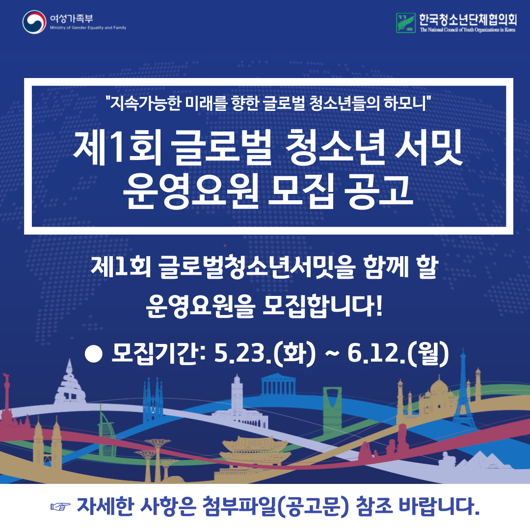 청협에서는 여성가족부와 함께 글로벌 청소년의 세계시민의식 함양 및 미래세대의 상생번영과 네트워크 구축을 위한 「제1회 글로벌 청소년 서밋」을 개최합니다. 이에, 행사를 운영 보조할 운영요원을 모집하오니 역량 있는 청소년들의 많은 관심과 참여 바랍니다. ○ 주최 / 주관: 여성가족부 / 한국청소년단체협의회