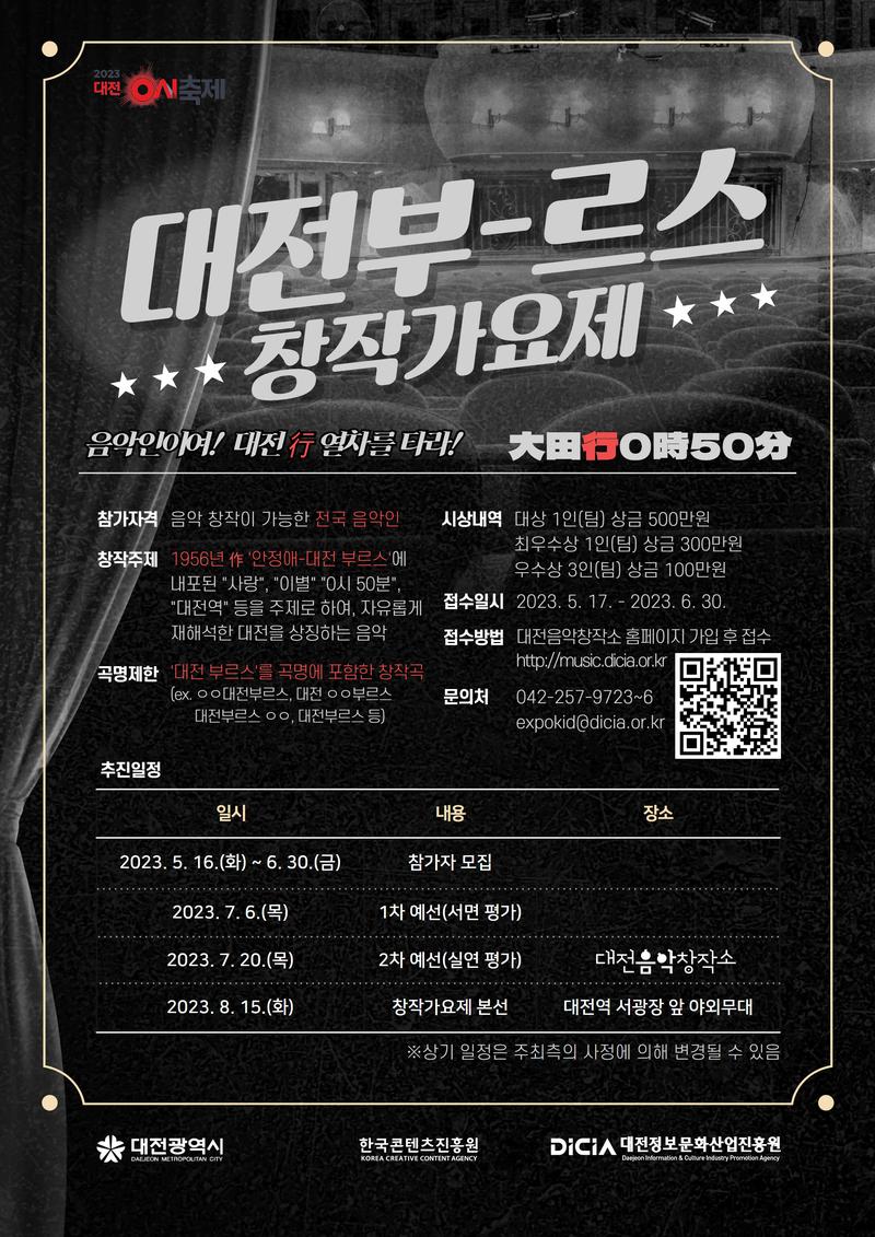 •음악 창작이 가능한 음악을 사랑하는 전국 뮤지션 참가 가능 •1956년 작 안정애 - 대전 부르스에 내포된 “사랑”, “이별”, “0시50분”, "대전역”등을 주제로 하여, 자유롭게 재해석한 대전을 상징하는 음악으로 참가 •‘대전 부르스’를 곡명에 포함한 창작곡 (ex. oo 대전부르스, 대전ooo부르스, 대전부르스 oo, 대전부르스 등) 상기 조건에 부합하는 음악으로 참가 가능하며, 5월 15일부터 6월 30일까지 접수 기간이며, 대전음악창작소 홈페이지 내에서 접수 가능합니다. 총 1,100만원의 상금으로 대전 0시축제 기간 내 본선무대까지 직접 진행하며! 대전의 여름을 뜨겁게 달궈줄 뮤지션을 대전음악창작소에서 기다리고 있습니다!