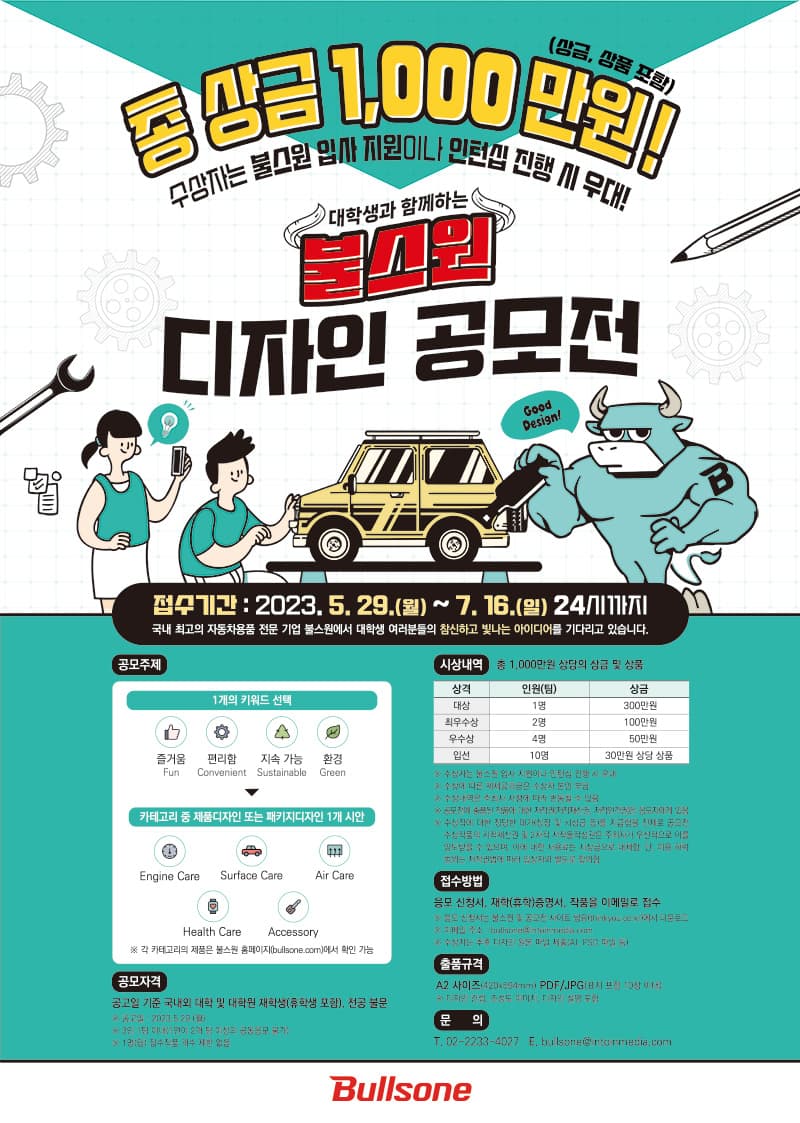 응모주제 1) 즐거움(Fun), 편리함(convenient), 지속가능(sustainable), 환경(Green) 중 1개 키워드 선택 2) 다음 카테고리 중 제품디자인 또는 패키지디자인 1개 시안 - Engine Care - Surface Care - Air Care - Health Care - Accessory ※ 각 카테고리의 제품은 불스원 홈페이지(bullsone.com)에서 확인 가능