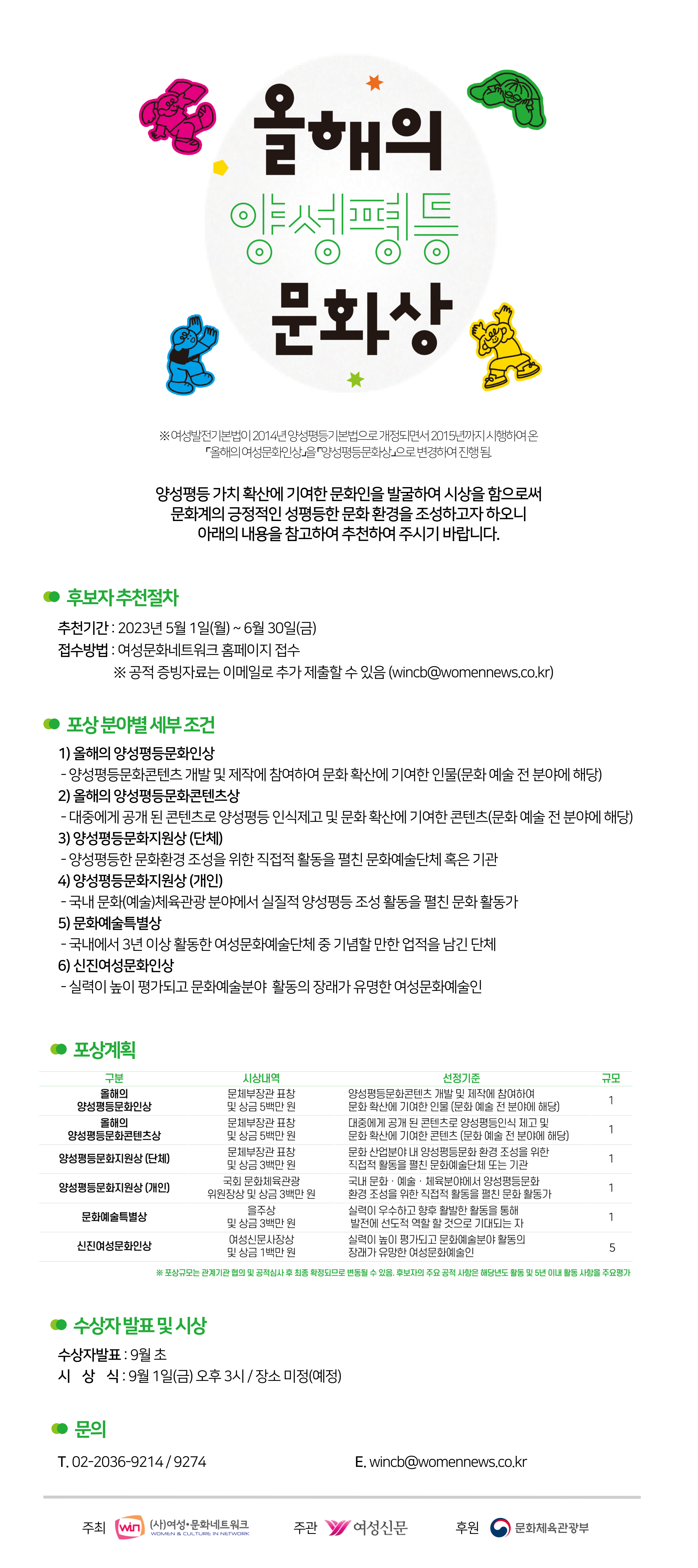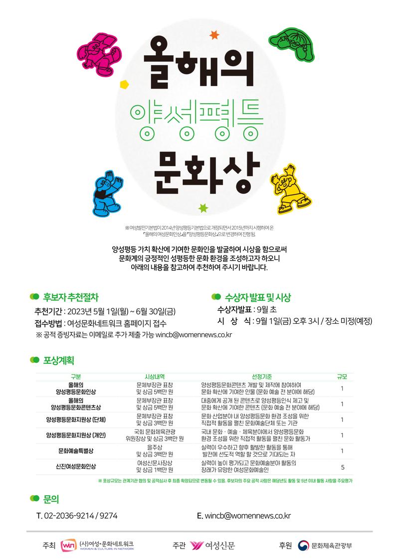 ○ 공모개요 - 추천기간 : 2023년 5월 1일\~6월 30일 - 접수방법 : 여성문화네트워크 홈페이지 접수 (http://www.networkwin.org/business/receive.php) *공적 증빙자료는 이메일로 추가 제출할 수 있음 (wincb@womennews.co.kr)