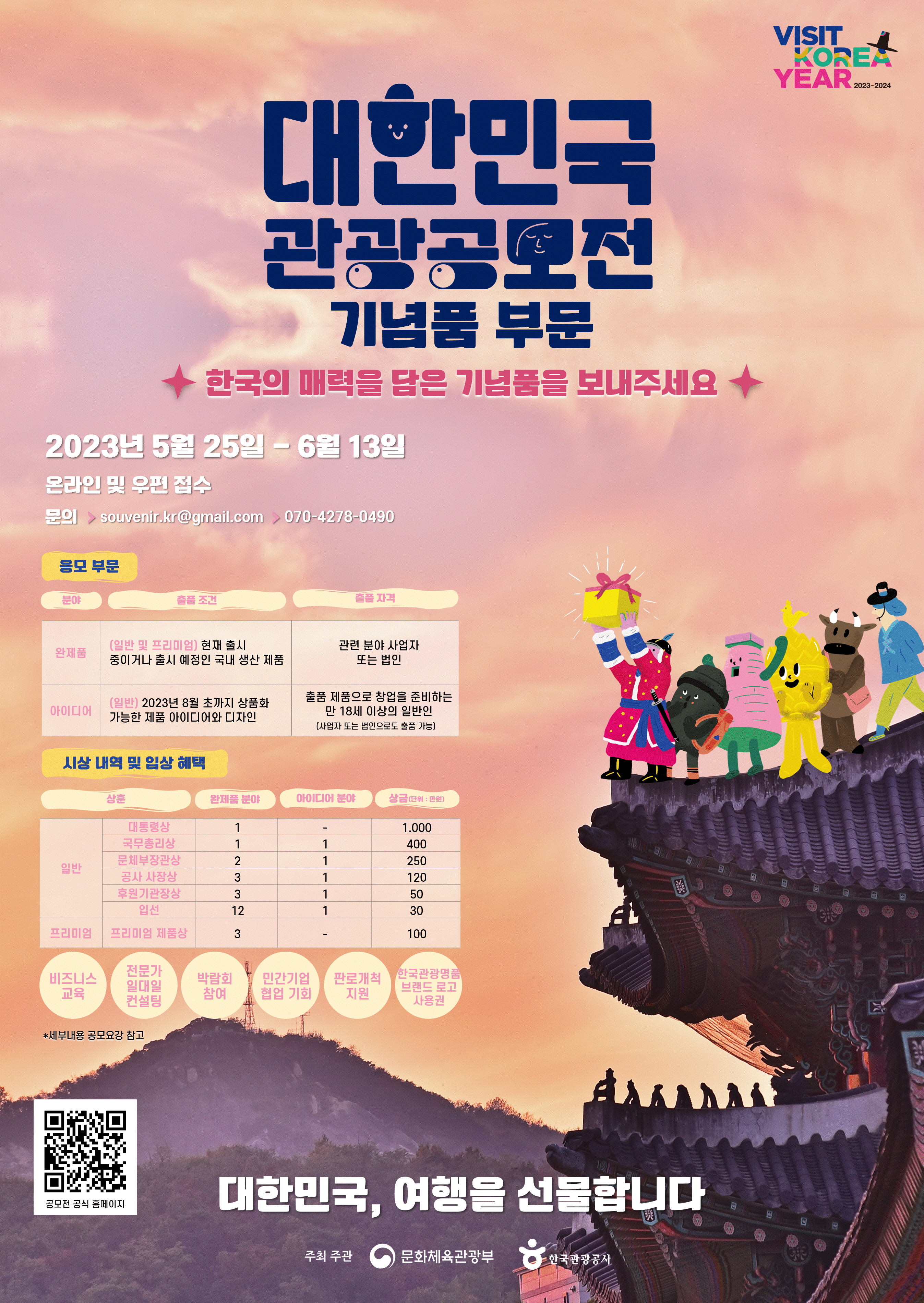 ○ 공 모 명 : 2023 대한민국 관광공모전(기념품 부문) ○ 주최/주관 : 문화체육관광부 / 한국관광공사 ○ 후 원 : 국립박물관문화재단, 한국공예‧디자인문화진흥원, 한국관광협회중앙회, 한국문화재재단 ○ 공모대상 - 한국의 역사·문화·자연·관광지·먹거리 등 매력적인 콘텐츠를 소재로 한 기념품 또는 상품화가 가능한 기념품 아이디어 ○ 공모 분야 및 출품 자격