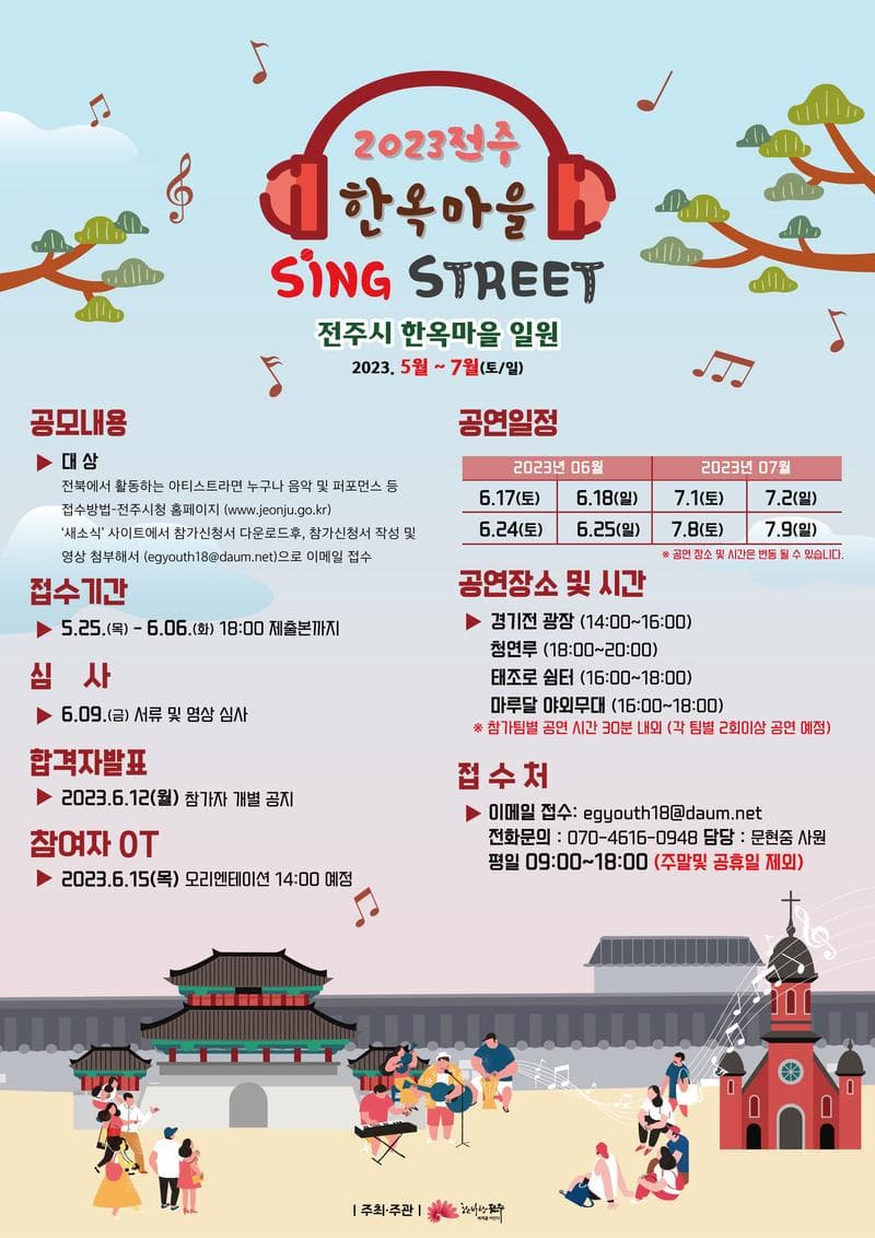 행 사 명: 2023 전주 한옥마을 Sing STREET 2차 '참여자 모집' 공모 내용: 대상 - 전북에서 활동하는 아티스트라면 누구나 장르 – 음악, 퍼포먼스 등 접수 방법: 전주시청 홈페이지(www.jeonju.go.kr) ‘새소식’ 사이트에서 참가신청서 다운로드후, 참가 신청서 작성 및 영상 첨부해서 egyouth18@daum.net으로 이메일접수 장 소 : 한옥마을 일대(경기전광장, 마루달, 대사습청, 태조로 쉼터, 청연루등) 공연 일정 : 2023년 6월 17(토), 18(일), 24(토), 25(일) 2023년 7월 1(토), 2(일), 8(토), 9(일) 공연 시간:경기전광장(14:00\~16:00 예정) 청연루(18:00\~20:00예정) 태조로 쉼터, 마루달 야외무대 (16:00\~18:00예정) 접수 기간 : 2023.5.25.(목)\~2023.6.6(화) 18:00까지 접 수 처 : 이메일접수 : egyouth18@daum.net 전화문의 070-4616-0948 담당: 문현중 사원 평일 09:00\~18:00 (주말 및 공휴일 제외) 심 사 : 2023.6.9.(금) 서류(영상)심사 합격자 발표 : 2023.6.12.(월) 개별통보 참여자 OT : 2023.06.15(목) 14:00 예정 (합격자 필참) 1회 최대 600,000원 이내, 2회시 최대 1,000,000원 이내