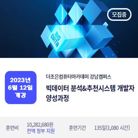 [더조은아카데미 - 강남캠퍼스] 훈련과정 - [K-Digital] 빅데이터분석 & 추천시스템 개발자 양성과정 교육일정 - 2023년 06월 12일 \~ 2023년 12월 22일 교육시간 - 10:00 \~ 18:40 (주5일 수업 / 일일 8시간) 교육비용 - 전액국비지원 교육문의 - 02-703-7025 / ocm7607@naver.com