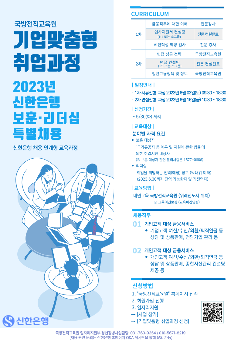※ 수료 후 컨설턴트 배정, 입사지원 및 면접 컨설팅, 진로상담 등 지원 5. 신청방법 및 각군 행정지원 1) 신청: 국방전직교육원 홈페이지-좌하단: [청년장병 사업참가신청] 온라인 신청 2) 접수 마감 후 신청자 중 선발인원 개별 통보(문자) 3) 교육원 → 각 군 본부 → 소속 부대에 선발인원 명단 통보 4) 선발자 교육여건 보장을 위한 행정조치(교육파견명령 등) 6. 교육문의 1) 채용 관련 문의는 신한은행 홈페이지 Q&A 게시판을 통해 문의 가능 2) 국방전직교육원 일자리지원부 청년장병사업담당: 031-760-9354 3) 뉴스타트Ⅱ유형 기업맞춤형 취업과정 위탁기관 ㈜맥시머스 교육 담당 010-5671-8219 / 010-3904-8219 (SMS 문의 및 신청). 4) 보훈 대상자 관련 문의사항은 1577-0606 끝.
