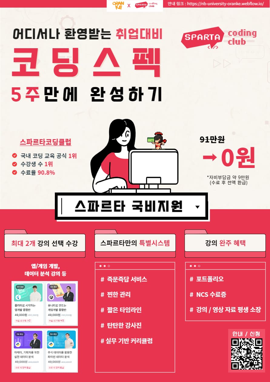 ● 모집 개요 코딩, 막연히 어렵다고 생각해왔나요? 그렇지 않습니다‼ 코딩교육 1위 기업 🔥스파르타코딩클럽🔥 국비지원과 함께라면요❗