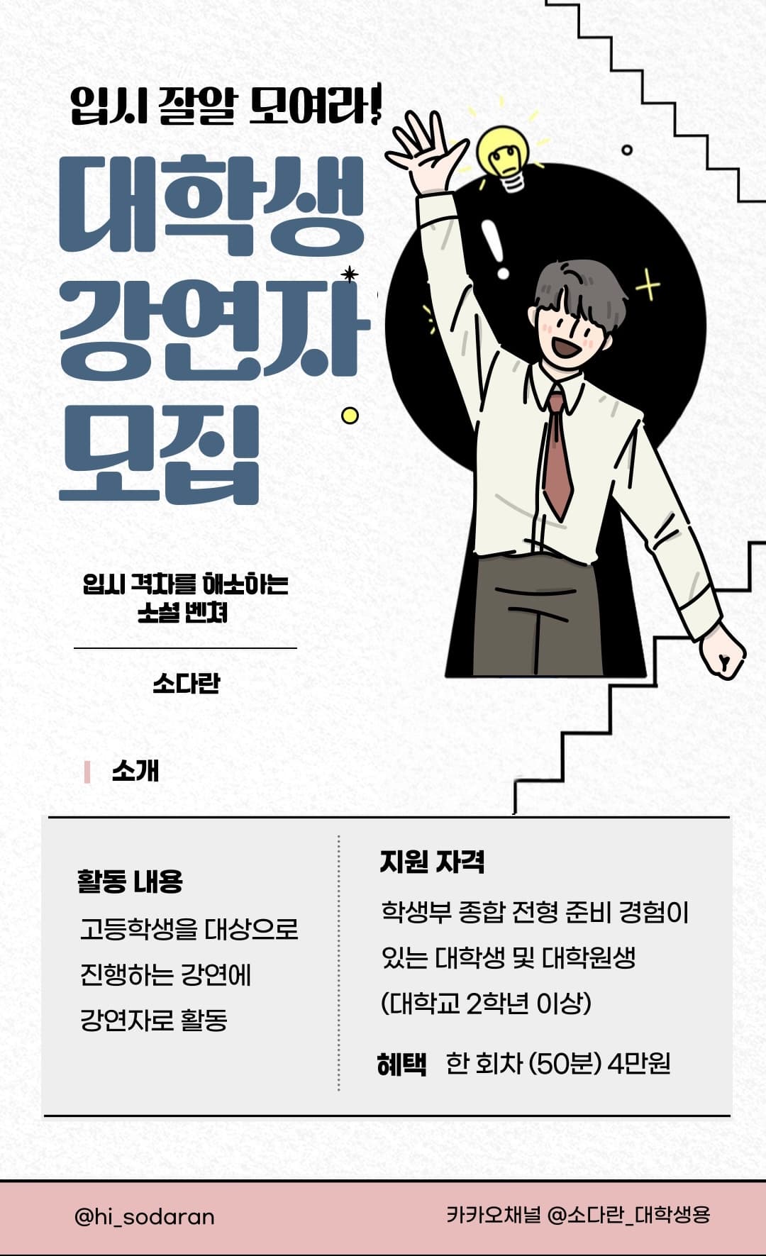 [소다란 고등학생 대상 강연자 모집 공고] * 모집 개요 소다란은 '모든 입시는 평등하다'라는 슬로건 아래, 입시 격차를 해소하는 비전을 가진 스타트업입니다. 고등학생들을 대상으로 진행하는 강연에 강연자로 활동해주실 대학생과 대학원생 여러분들을 모집하고자 합니다.
