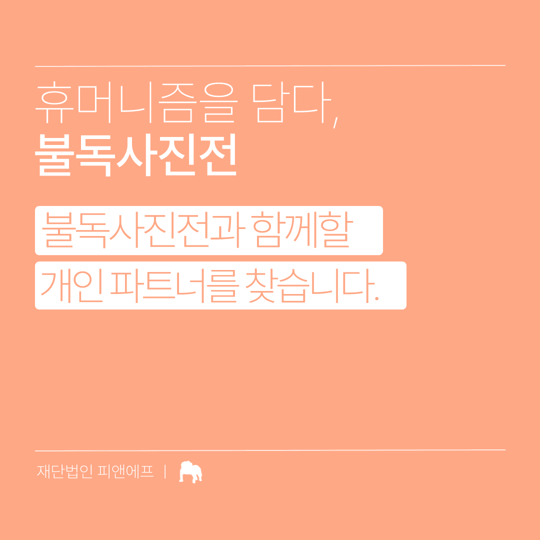 상세 내용 안녕하세요. 재단법인 피앤에프 입니다.😊 2023년 하반기에 개최될 불독 사진전은 '가슴뭉클한 사진'이라는 부제로, 휴머니즘을 중심으로 인간적이고 따뜻한 모습이 담긴 작품을 선보일 예정이며, 전문가와 아마추어 누구나 참여 가능해 시민 모두가 직접 참여하여 만들어가는 사진전입니다. 불독 사진전과 첫 시작을 함께 하는 '개인 파트너'를 모집합니다.🤎