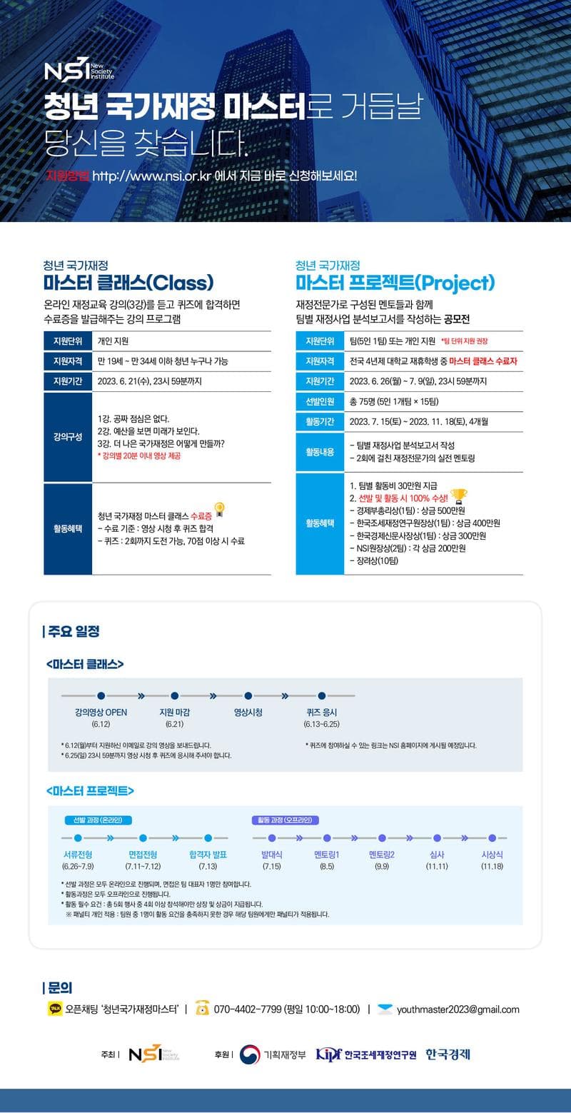 ○ 문의 - 카카오톡 오픈채팅 : 청년국가재정마스터 - 유선전화 : 070-4402-7799 (NSI 미래교육센터) - 이메일 : youthmaster2023@gmail.com