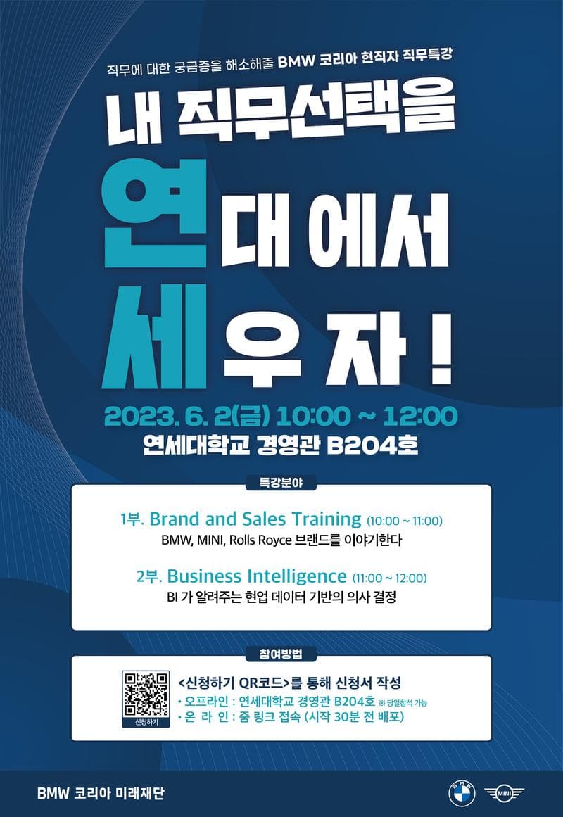 BMW 코리아 현직자 직무특강 <영 탤런트 드림 프로젝트> ✔일시 : 6/2(금) 10:00\~12:00 ✔장소 : 연세대학교 경영관 B204호 ✔직무 - Brand and Sales Training (10:00\~11:00) : BMW, MINI, Rolls Royce 브랜드를 이야기한다 -Business Intelligence (11:00\~12:00) : BI가 알려는 현업 데이터 기반의 의사 결정