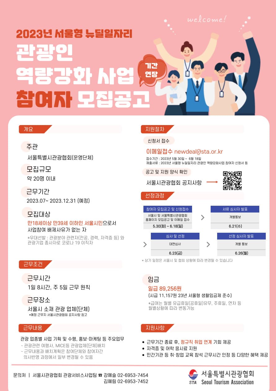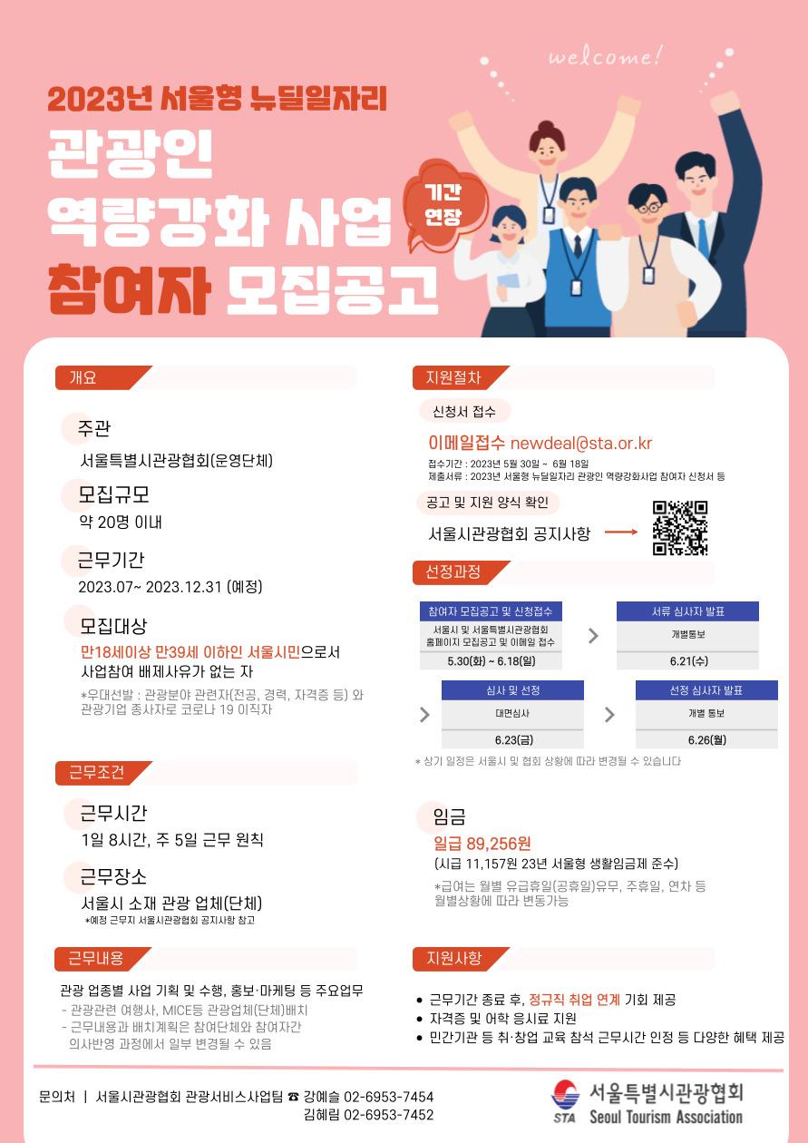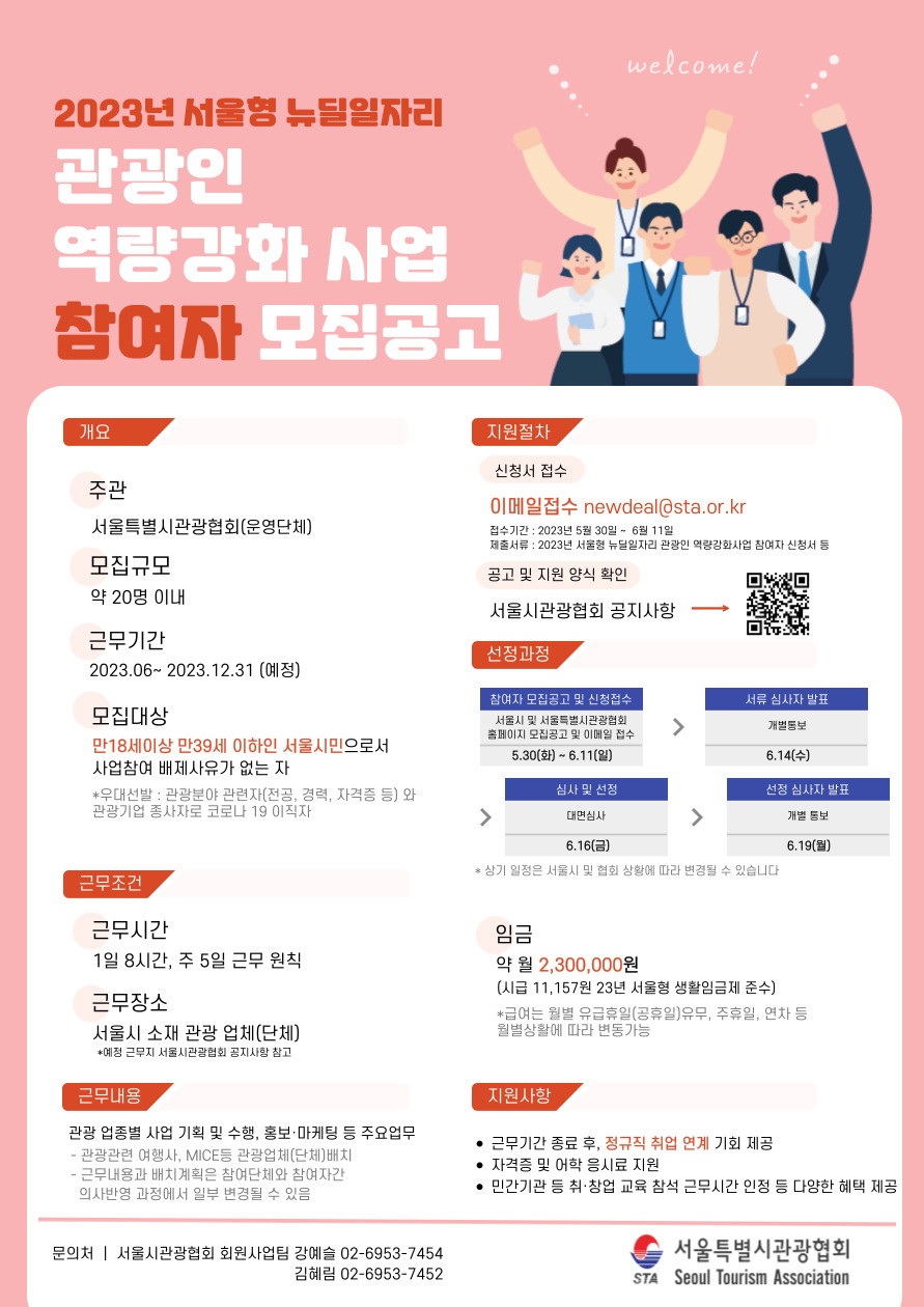 [모집개요] - 사업명 : 2023년 서울형 뉴딜일자리 관광인 역량강화사업 - 모집규모 : 약 20명 이내 - 근무기간 : 2023.07 \~ 2023.12.31(예정) - 모집대상 : 만 18세 이상(2005년 이전 출생자) 만 39세 이하의 서울시민으로서 관광분야 근무를 희망하는자로 사업참여 배제사유가 없는 자 *관광분야 관련자 (전공, 경력, 자격증 등)와 관광기업 종사자로 코로나19 이후 이직자는 우대선발 - 주관: 서울특별시관광협회(운영단체) 신청서 접수 : 이메일접수(newdeal@sta.or.kr) *접수기간 : 05.30(화) \~ 06.18(일) *제출서류 : 2023년 서울형 뉴딜일자리 관광인 역량강화 사업 참여자 신청서 등 [근무조건] 1. 임금 : 약 월 2,300,000원 이상 (시급 11,157원, 23년 서울형 생활임금제 준수) *급여는 월별 유급휴일(공휴일)유무, 주휴일, 연차 등 월별상황에 따라 변동가능 2. 근무기간 : 2023.07 \~ 23.12.31(예정) *근무기간 종료 후, 정규직 전환 및 취업연계 기회 제공 3. 근무장소 : 서울시 소재 관광 업체(단체) *예정 근무지 서울시관광협회 공지사항 참고 4. 근무내용 : 관광 업종별 사업 기획 및 수행\, 홍보·마케팅 등 주요업무 5. 근로조건 : 1일 8시간\, 주 5일 근무 원칙\, 주·연차수당 지급 (사업 특성상 주말 근무가 불가피한 경우 평일 대체 휴무일 부여) 6. 4대 보험 의무가입 [지원사항] 1. 자격증 및 어학 응시료 제공(외국어\, 컴퓨터 등) 2. 참여자 노트북 무상대여 (8개월) 3. 직업능력개발 훈련비 지원 4. 참여자간 동아리 및 활동 모임 등 조직시 회의공간 및 사무용품 등 지원 5. 관광사업 관련 분야의 세미나\, 포럼 등 정보 제공 6. 취·창업 교육 참석 근무시간 인정 7. 사업 종료 후 취업 연계 지원 8. 참여자 채용검진비 일부 지원 *자세한 내용은 모집공고문 참고 문의처 :서울특별시관광협회 관광서비스사업팀 강예슬 02-6953-7454 김혜림 02-6953-7452 서울특별시관광협회 02-757-7492