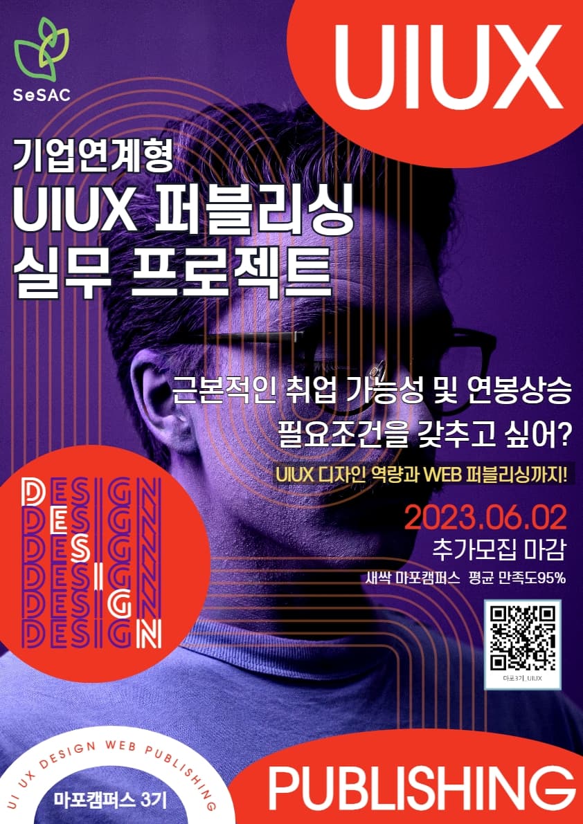 ✅과정명 SeSAC(청년취업사관학교) 마포Dt _ 기업연계형 UIUX 퍼블리싱 실무 프로젝트 과정 3기 교육생 추가 모집중 (\~06/02) ✅교육비 전액 무료 (단, 교육생 학습의지 제고를 위한 예치금 납입, 수료후 전액 반환) ✅기간 추가 모집 : 2023.06.02(\~23:59)까지 ⏰접수기간 2023.04.10(월) \~ 2023.05.22(월) / \~23:59까지 ⏰교육기간 2023.05.29(월) \~ 2023.08.22(화) / 매주월\~금(09:00\~18:00) ✅신청방법 1️⃣새싹홈페이지에서 (기업연계형 UIUX 퍼블리싱 실무 프로젝트)과정을 신청한다. 2️⃣구글폼(자기소개서)를 신청한다. 상세페이지 살펴보기>> '기업연계형 UIUX 퍼블리싱 실무 프로젝트' ✅교육정원 30명 선발 ✅교육장소 서울특별시 마포구 백범로 31길21, 서울창업허브 SeSAC(청년취업사관학교)마포캠퍼스 9층 ✅문의처 02-2152-3962 / 02-2152-3915 open@exc.co.kr 카카오톡 : 엑스퍼트아카데미