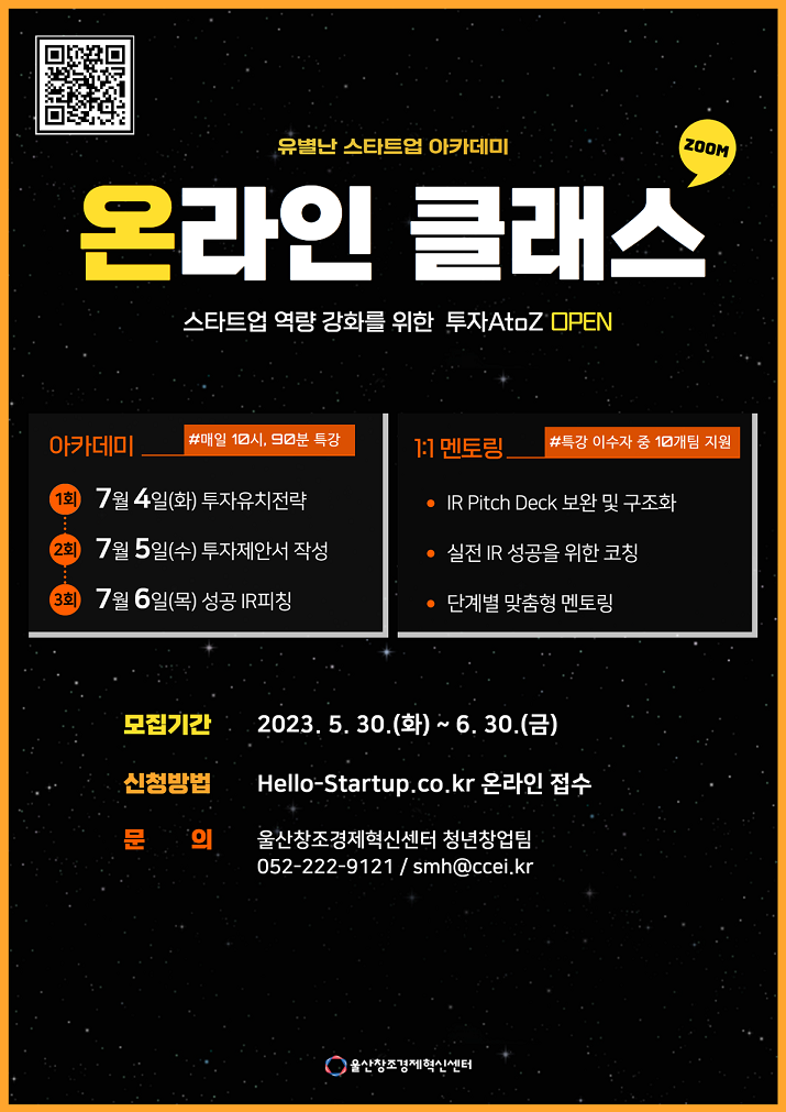 울산창조경제혁신센터에서는 (예비)창업자를 위한 투자유치 전략 수립 및 투자제안서 작성 등 단계별 투자교육을 통한 창업자 역량 강화를 도모하기 위해 [유별난 스타트업 아카데미 온라인 클래스(투자 AtoZ)]을 모집하오니 많은 관심 부탁드립니다.