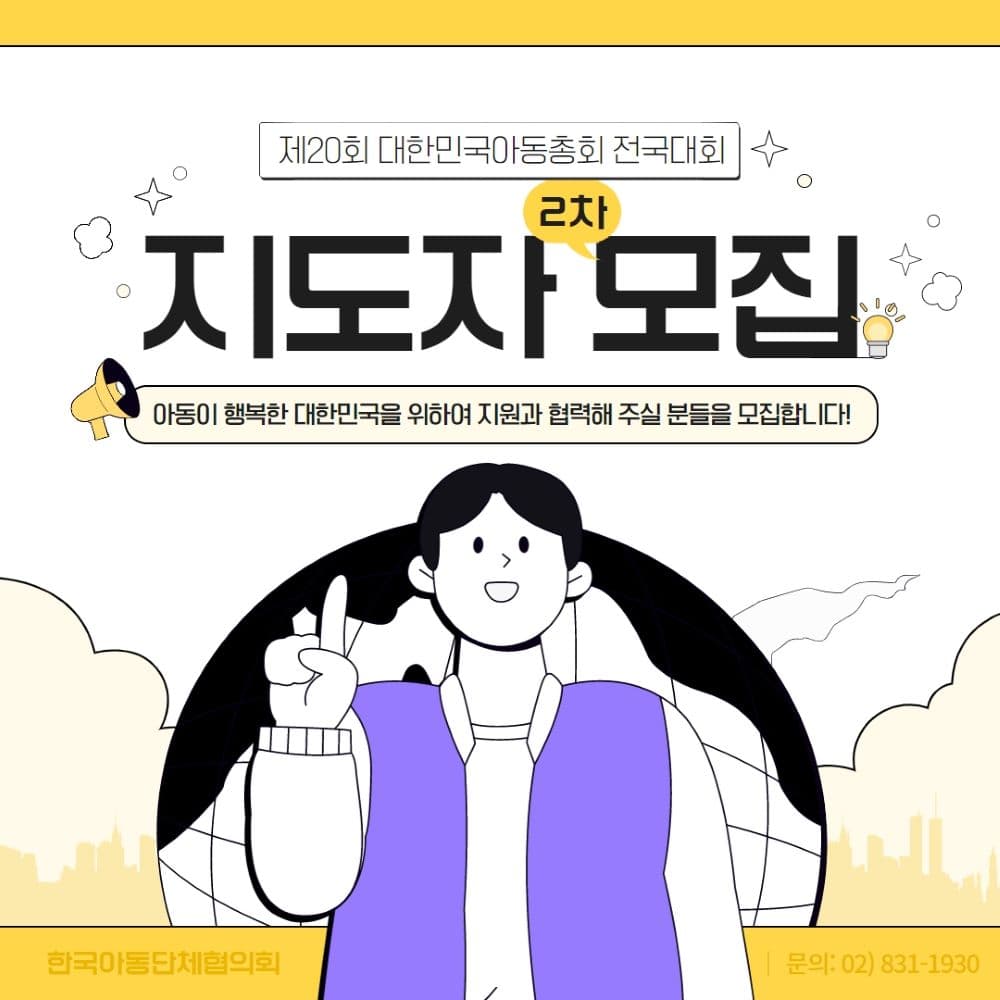 ○ 제20회 대한민국아동총회 전국대회 지도자 2차 모집 1) 모집대상 : 아동과 아동권리에 관심있는 대학(원)생 및 유관 학과 재학생 2) 모집인원 : 담임지도자 15명 / 관리지도자 10명 3) 필수요건 : 모든 일정과 역할에 성실히 참여할 수 있는 분 (우대요건 : 후속활동 참여 가능한 분, 유사활동 경험자) 4) 활동혜택 : VMS봉사시간 및 활동수료증, 소정의 기념품 지급