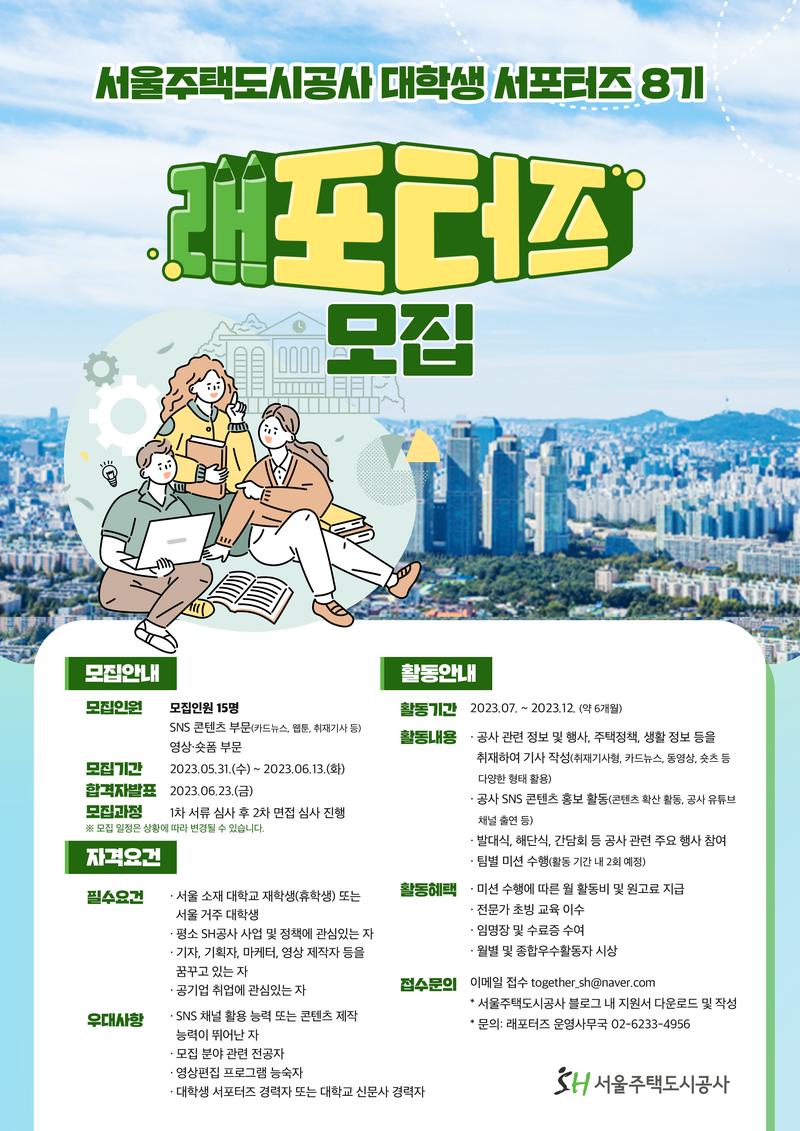 1. 모집안내 ① 모집인원 15명 SNS 콘텐츠 부문(카드뉴스, 웹툰, 취재기사 등) 영상 숏폼 부문 ② 모집기간 2023.05.31.(수) \~ 2023.06.13.(화) ③ 합격자 발표 2023.06.23.(금) ④ 모집 과정 1차 서류 심사 후 2차 면접심사 진행 ※ 모집 일정은 상황에 따라 변경될 수 있습니다. 2. 자격요건 ① 필수요건 · 서울 소재 대학교 재학생(휴학생) 또는 서울 거주 대학생 · 평소 SH공사 사업 및 정책에 관심있는 자 · 기자, 기획자, 마케터, 영상 제작자 등을 꿈꾸고 있는 자 · 공기업 취업에 관심있는 자 ② 우대사항 · SNS 채널 활용 능력 또는 콘텐츠 제작 능력이 뛰어난 자 · 모집 분야 관련 전공자 · 영상편집프로그램 능숙자 · 대학생 서포터즈 경력자 또는 대학교 신문사 경력자 3. 활동안내 ① 활동기간 2023.07. \~ 2023. 12. (약 6개월) ② 활동내용 · 공사 관련 정보 및 행사, 주택정책, 생활 정보 등을 취재하여 기사 작성(취재기사형, 카드뉴스, 동영상, 숏츠 등 다양한 형태 활용) · 공사 SNS 콘텐츠 홍보 활동(콘텐츠 확산 활동, 공사 유튜브 채널 출연 등) · 발대식,해단식, 간담회 등 공사 관련 주요 행사 참여 · 팀별 미션 수행(활동 기간 내 2회 예정) ③ 활동혜택 · 미션 수행에 따른 월 활동비 및 원고료 지급 · 전문가 초빙 교육 이수 · 임명장 및 수료증 수여 · 월별 및 종합우수활동자 시상 4. 접수문의 · 이메일 접수 together_sh@naver.com · 서울주택도시공사 블로그 내 지원서 다운로드 및 작성 · 문의: 래포터즈 운영사무국 02-6233-4956 자세한 내용 보러가기 https://blog.naver.com/together_sh/223116257642