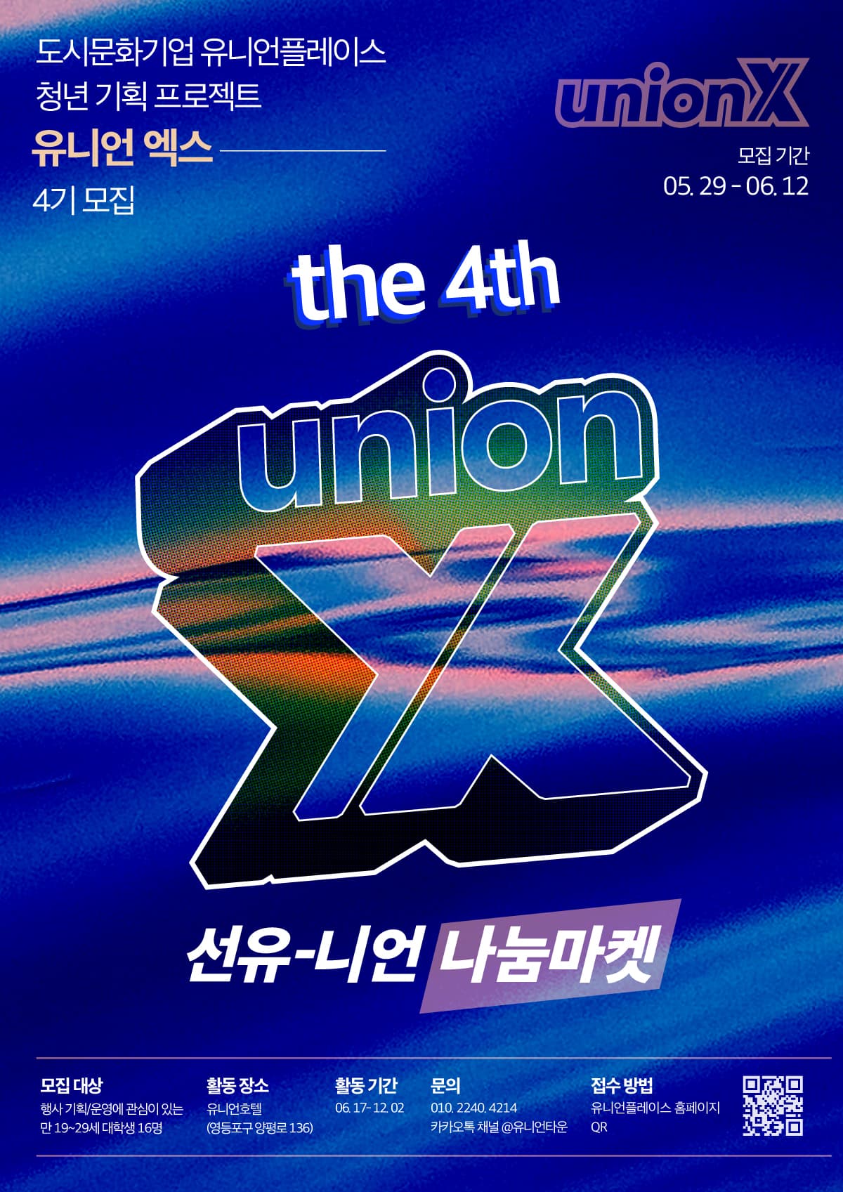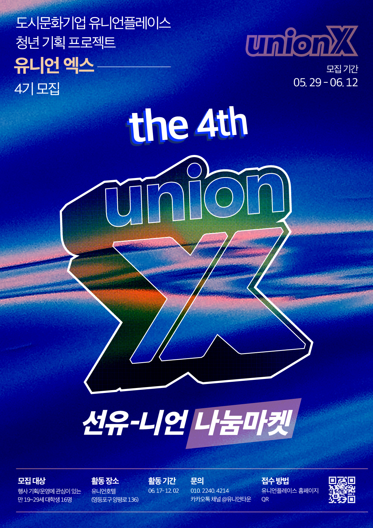 유니언X 4기 ‘선유니언 마켓’ 기획단 모집‘선유니언마켓‘은 대학생 청년들과 마을 주민이 함께 건강한 공동체 문화를 고민하고, 판매처를 기반으로 지역 내 소상공인의 발전을 도모하는 지역 활성화 프로젝트입니다. 자발적인 참여와 나눔을 통해 선유도역의 문화를 기획하고 운영하는 경험의 장입니다.모집기간 : 2023. 05. 29. \~ 2023. 6.12. 까지
