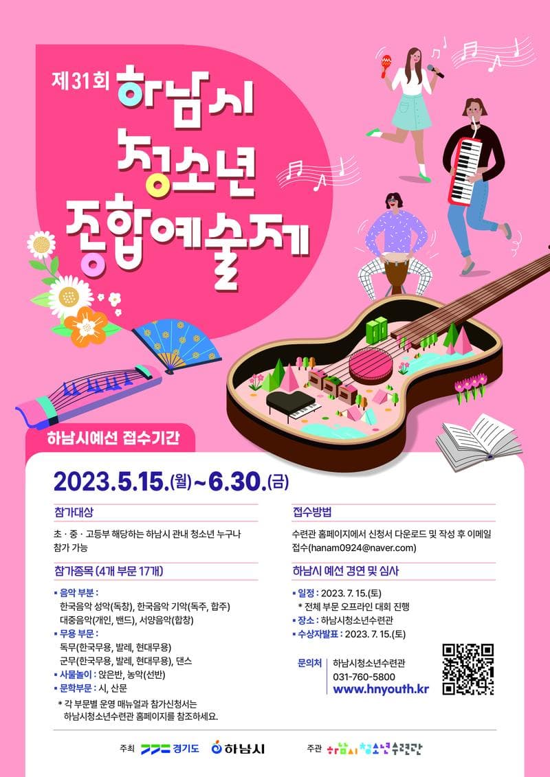 ■ 참가대상 • 초ㆍ중ㆍ고등부 해당하는 하남시 관내 청소년 누구나 참가 가능 • 초등부는 저·고학년 구분 없이 3학년부터 6학년까지 참가 가능 • 재학생의 경우 주소지에 상관없이 재학 중인 학교가 하남시 관내여야 함 • 재학생의 경우 학교가 기준이 되므로 검정고시/조기입학으로 고등부 연령이라도 대학교 재학생의 경우 참가할 수 없음 • 학교 밖 청소년(비인가 대안학교 재학생 포함)의 경우 검정고시 합격여부 확인 - 하남시 대회의 접수 및 신청은 개인 또는 단체 누구나 가능 - 재학생은 하남시 관내 학교\, 학교밖 청소년은 하남시 거주 기준으로 신청 가능 • 학교밖청소년의 경우 청소년 관련 단체장 추천 가능 - 정부및 지방자치단체에 등록된 청소년관련 시설 및 단체장 또는 문화예술 및 청소년에 관련된 법인 단체장의 추천가능 - 정부 인가를 받은 대안학교의 청소년은 재학생으로 구분하여 학교장의 추천을 받도록 하고\, 인가받지 않은 대안학교에 다니는 청소년의 경우 학교밖청소년으로 구분하여 1번에 해당하는 단체장의 추천을 받아 참가하도록 함 • 종목 구분이 다른 경우 중복참가가 가능하지만 같은 종목에 중복 참가는 불가 <예시> 예1_ 발레 독무와 발레 군무 참가 = 가능 예2_ 대중음악 개인과 대중음악 밴드 참가 = 가능 예3_ 발레 군무 A팀과 발레 군무 B팀 참가 = 불가능 • 연합팀 신청 시 경기도 관내 거주 및 재학 중인 초ㆍ중ㆍ고등부에 해당하는 청소년팀으로 구성 • 연합팀의 리더는 하남시 거주 또는 하남시 관내 학교에 재학중을 원칙으로 함 : 경기도 관내 학교 연합은 가능하나 교급 혼합은 연합팀 구성 불가 <예시> 예1_ 하남시 A중학교 + 하남시 C중학교 = 가능 예2_ 하남시 A중학교 + 타시 C중학교 = 가능 예3_ 하남시 A중학교 + 하남시 C고등학교 = 불가능 ■ 경연방법 : 부문별 상이, 첨부파일(제31회 하남시청소년종합예술제 안내책자) 참조 ■ 심사 일정 및 시상식 : 2023년 7월 15일(토) 14:00\~18:00, 하남시청소년수련관 *제31회 예술제는 모든 종목 오프라인으로 심사 진행하며, 심사 당일 수상자 발표에 따른 시상직도 함께 진행될 예정 ■ 접수/문의처 : 하남시청소년수련관 ☎ 031)760-5800 / E-mail : hanam0924@naver.com ※운영 매뉴얼 및 참가 신청서는 공지사항에 파일 첨부되어 있습니다. 내용 확인 바랍니다! ■ 제31회 하남시청소년종합예술제 운영기간 • 참가신청 및 접수 : 2023. 5. 15(월) \~ 6. 30(금) • 오프라인 경연일 : 2023. 7. 15(토) 14:00\~18:00 • 수상자 발표 : 2023. 7. 15(토) 18:00 *제31회 예술제는 모든 종목 오프라인으로 심사 진행하며, 심사 당일 수상자 발표에 따른 시상식도 함께 진행될 예정입니다. ■ 경연내용 : 4개 부문 17개 종목 • 음악부문 : 한국음악 성악독창/기악독주/기악합주, 대중음악 개인/밴드, 서양음악 합창 • 무용부문 : 한국무용 독무/군무, 현대무용 독무/군무, 발레 독무/군무, 댄스 • 사물놀이 부문 : 사물놀이 앉은반, 농악 선반 • 문학부문 : 시, 산문