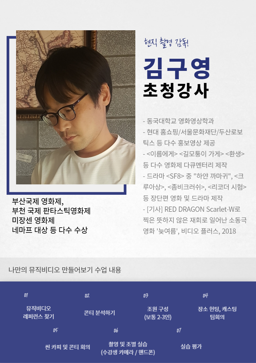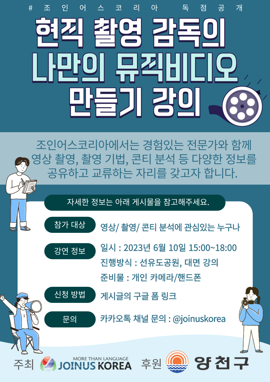 조인어스코리아는 영상 촬영, 촬영 기법 등에 관심 있는 분들에게 양질의 교육을 제공하기 위해 경험 많은 전문가와 함께 ‘나만의 뮤직비디오 만들기’ 강의를 개최합니다. 영상을 더 잘 찍고 편집하는 방법은 무엇인가, 상황에 더 적합한 콘티는 무엇인가, 촬영 기법에는 어떤 것이 있으며 어느 상황에 써야 할까 등에 대한 다양한 정보를 공유하고 교류하는 자리를 갖고자 하며, 대면으로 진행하고자 합니다.