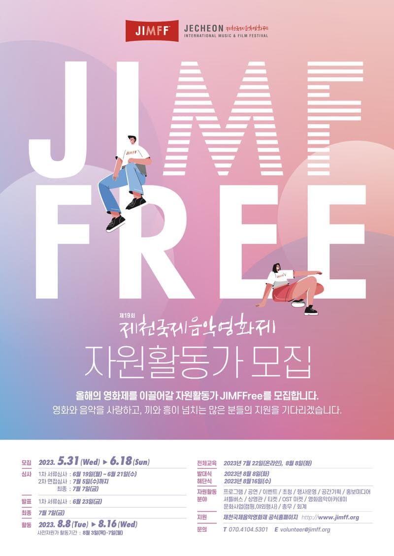 안녕하세요. 제천국제음악영화제 사무국입니다. 영화와 음악, 그리고 자연이 함께하는 제19회 제천국제음악영화제에서 올해의 영화제를 이끌어갈 자원활동가 JIMFFree를 모집합니다. 영화와 음악을 사랑하고, 끼와 흥이 넘치는 많은 분들의 지원을 기다리겠습니다. 감사합니다. ■ 일정 - 접수: 5월 31일(수) 12:00 \~ 6월 18일(일) 24:00 - 서류 합격자 발표: 6월 23일(금) - 면접: 7월 5일(수)까지 - 최종 합격자 발표: 7월 7일(금) ■ 지원 방법 - 접수 기간: 5월 31일(수) 12:00 \~ 6월 18일(일) 24:00 마감 ■ 자격 요건 - 만 19세 이상으로 한국어로 소통이 가능한 자 - 영화제 전 기간\, 종일 활동이 가능한 자 - 영화제 기간 동안 제천시에서 활동 가능한 자 (제천 지역 외 거주자 숙박 지원) - 영화와 음악을 사랑하는 자 - 사전 교육 및 영화제에 적극적인 참여가 가능한 자 ■ 모집 분야 - 공식초청팀\, 공연이벤트팀\, 관객서비스팀\, 디자인팀\, 마케팅팀\, 영화음악아카데미\, 프로그램팀\, 홍보미디어팀\, 행사운영팀\, OST마켓팀 ■ 활동 기간 - 사전교육: 7월 22일(온라인)\, 8월 8일(화) - 발대식: 8월 8일(화) - 해단식: 8월 16일(수) - 활동 기간: 8월 8일(화) \~ 8월 16일(수) ■ 지원 사항 - 자원활동가 유니폼&배지\, 영화제 기념품을 제공합니다. - 제천 외 지역 거주 시 숙박을 제공합니다. - 활동 기간 동안 식비 및 대중교통비(시내버스)를 지급 합니다. - 영화제 기간 동안 1일 1회 간식 & 음료를 제공 합니다. - 영화제 메인 카탈로그에 자원활동가로 등재됩니다. - 자원봉사활동 시간으로 인정 받습니다. (자원봉사포털 1365 가입 필수) - 제천국제음악영화제 자원활동 참여 인증서를 수여합니다. ■ 문의사항 제천국제음악영화제 서울사무국 TEL: 070-4177-8121 E-MAIL: volunteer@jimff.org