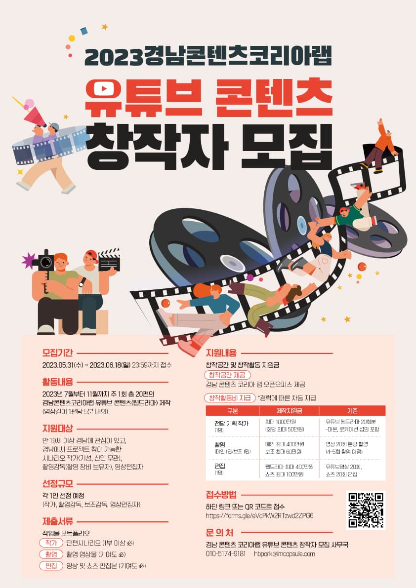📌접수방법 하단 링크 또는 QR 코드로 접수 https://forms.gle/eVdPkW2RTzwd2ZPG6 📌문의처 경남 콘텐츠 코리아랩 유튜브 콘텐츠 창작자 모집 사무국 010-5174-9181 hbpark@imcapsule.com