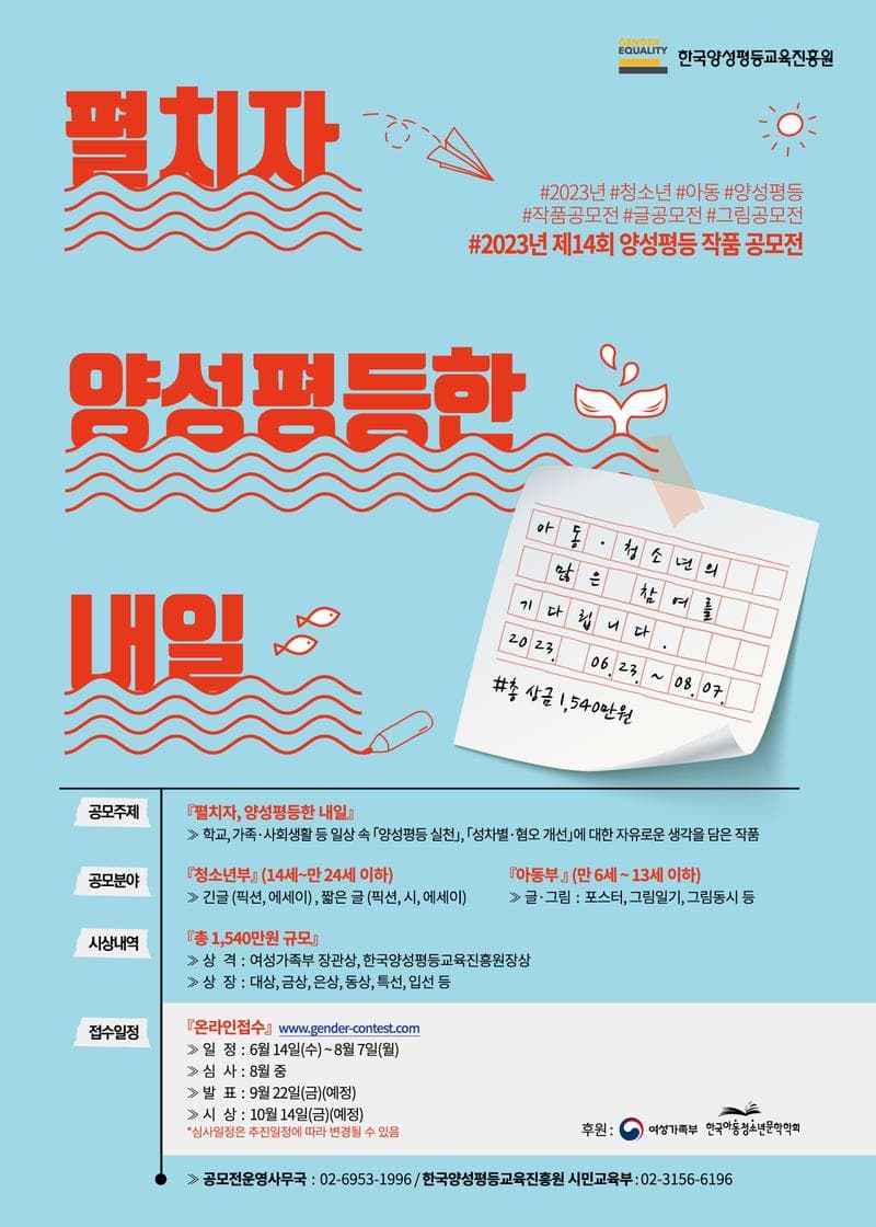◈ 공모대상 「양성평등」과 이를 주제로 한 작품 창작(문학, 글‧그림)에 관심 있는 아동‧청소년 > ◦ (청소년부) 만14세 \~ 만24세 이하(해당 연령 청소년) ◦ (아동부) 만13세 이하(해당 연령 아동) ◈ 공모주제 : 「펼치자, 양성평등한 내일」 ◦ 학교, 가족‧사회생활 등 일상 속 「양성평등 실천」, 「다양성 존중」,「성차별‧혐오 개선」에 대한 성평등 관점의 자유로운 생각과 주제를 담은 작품 - (내용요소) 다양한 일상영역의 젠더 이슈 등을 소재로 자유롭게 문예작품으로 창작하여 양성평등 관점을 보여주는 작품 - 아동‧청소년들의 일상 속 경험\, 문화\, 에피소드를 소재로 성평등 실천 아이디어를 이야기로 구성 ※ 주장이나 설명보다는 문학적 상상력이 담긴 이야기(스토리)가 있는 작품 ◈ 도움 영상 자료 ◦ 공모주제와 관련하여 총 5편의 시리즈로 작품의 형식, 장르, 소재, 방법 등 다양하게 성평등을 표현하고 창작할 수 있도록 안내하는 영상입니다. - [공진하 작가] 차별의 턱을 없애주는 경사로\, 성평등 - [이지유 작가] 성평등은 과학을 자유롭게 한다 - [안성훈 작가] 엉뚱한 상상으로 세상을 아름답게 - [이 현 작가] 여덟 색깔 무지개로 함께 빛나요 - [김지은 교수] 성평등은 나와 우리의 이야기 ◈ 공모분야 ◦ 청소년부 : 긴 글(픽션 / 에세이) - 픽션(소설\, 동화 등)\, 에세이(경험담\, 매체비평 등) - A4 7매 이내(글자크기 11p\, 줄간격 160%) (200자 원고지 7장 이내) ◦ 청소년부 : 짧은 글(500자 : 시 / 픽션 / 에세이) - 시 / 500자 픽션(짧은 소설\, 짧은 동화) / 500자 에세이 / 500자 이내(공백 제외)(글자크기 11p\, 줄간격 160%) ◦ 아동부 (포스터, 그림일기, 그림동시 등) - 그림일기\, 포스터\, 그림 동시\, 만화 등 - 8절 도화지 1매 (272*394mm)직접 그린작품 (그림형식 자유) ◈ 운영일정 ◦ 홍보기간 : 5월 \~ 8월 7일(금) ◦ 접수기간 : 6월 14일(수) \~ 8월 7일(월) 18:00 까지 ◦ 심 사 : 8\~9월 중 ◦ 최종발표 : 9월 22일(금) ◦ 시 상 식 : 10월 13일(금)(예정) ※ 전체일정은 기관 사정에 따라 변경될 수 있음 ◈ 시상내역 ◦ 총 상금 : 1,540만원 ◦ 상 격 : 대상, 금상, 은상, 동상, 특선, 입선등 ※ 작품의 수준에 따라 심사과정 중 시상 등급이 조정될 수 있으며, 입상자가 없는 부문(상격)이 발생할 수 있음(적합한 작품이 없을 경우 선정하지 않을 수 있음) ◈ 작품 창작 시 고려사항 ◦ 심사 주안점 - 기획 및 독창성 / 완결성 / 성평등한 감수성 / 효과성(활용성) ◈ 출품규격 및 방법 ◦ 미 발표작에 한함 ◦ 개인 출품가능 - 분량은 최대치 기준이며\, 기준보다 적어도 심사에 영향 없음. - 홈페이지 양식 활용(응모서식 및 참가신청서) : 양식 내에 작성에 관한 안내사항 준수 - 아동부 직접 그린 작품을 스캔하여 파일로 제출하고 추후 원본(원화) 상태로 출품(액자 출품 불가) - 아동부는 1차 합격 작품에 한해\, 2차 작품 원화 우편 제출 및 접수 - 관련 문의 : 홈페이지 별도 공지\, 한국양성평등교육진흥원 공모전 담당자(02-3156-6196) ◈ 접수방법 ◦ 접 수 처 : 공모전 홈페이지 온라인 접수(http://gender-contest.com) ◦ 접수방법: ① 작품접수 신청서 외 양식(저작권, 개인정보 관련) 1부, ② 작품 파일* ※ 신청서 등 양식을 공모전 홈페이지에서 다운받아 작성 후 작품접수 시 작품파일(hwp, doc, docx, JPG파일, 스캔파일(PDF) 등)과 함께 제출하시기 바랍니다. ※ 아동부는 1, 2차로 접수 진행: (1차) 홈페이지 접수, (2차) 1차 합격자에 한해 우편 접수 ◈ 문의처 ◦ 공모전 관련 및 단체 접수 문의 - (유선) 02-3156-6196\, (이메일) sycho@kigepe.or.kr ◦ 접수 오류 문의 - (유선) 02-6953-1996\, (문의채널) pf.kakao.com/_UtGIb/friend - 접수에 어려움이 있을시 채널 문의 및 공지사항 확인 부탁드립니다. ◈ 양성평등 무료교육 ◦ 한국양성평등교육진흥원 이러닝센터(www.kigepe.or.kr/elearning/user/Main.do) - 회원가입 후 「양성평등열린교육」 무료수강 (교육확인서 발급 가능) ◦ 양성평등 영상콘텐츠 : 젠더온(http://genderon.kigepe.or.kr) - 다양한 영상콘텐츠를 통해 ‘성평등’에 대해 학습가능 ◦ 이전 수상작 참고 - 공모전 홈페이지(www.gender-contest.com) 자료실 내 수상작품집 확인 ◈ 유의사항 ◦ 접수 이후에 작품을 수정하거나 변경할 수 없습니다. ◦ 작품조건은 미발표한 순수창작물에 한합니다. - 기존 공모전 수상 작품과 유사한 내용의 작품은 입상에서 제외 또는 취소 - 규정 및 출품규격에 맞지 않는 작품은 심사대상에서 제외 - 표절이나 도용\, 모방의 경우 작품이 선정된 이후라도 무효처리 및 상금 회수 ◦ 개인 자격으로 출품 가능하며, 출품 개수의 제한 없습니다. ◦ 열리지 않는 파일 확장자, 양식 미준수 등으로 인한 문제는 출품자 본인에게 있습니다. ◦ 제출하는 모든 서류 및 제출물은 반환하지 않으며, 주최기관에 이의를 제기하지 않아야 합니다. - 입상하지 않은 출품작과 신청서류는 공모전 종료 후 1개월 이내에 전부 삭제처리함 - 다만\, 아동부 그림 원본의 경우 입상하지 않은 출품작에 한하여 반환신청을 받아 우편으로 반환하며 시기는 공모전 홈페이지를 통해 공지 ◦ 상금에 대한 제세공과금은 수상자가 부담합니다. ◦ 작품의 텍스트 작성 시, 맞춤법이 틀린 경우 주최