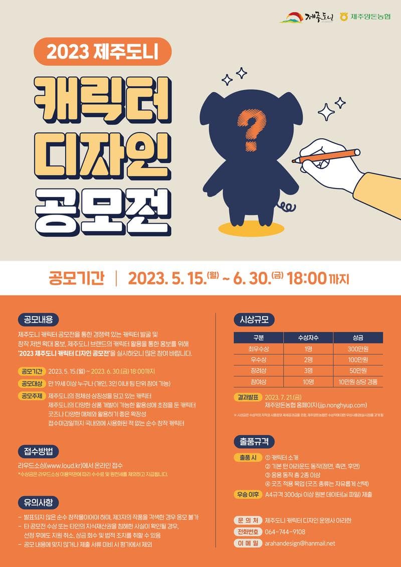 한 줄 소개 제주도니는 한라산과 햇살이 어우러져 깨끗하며 때묻지 않은 제주자연에서 잘 자라난 최고급 돈육을 뜻하는 제주양돈농협의 브랜드 네임입니다. 1. 브랜드 소개 제주도니의 브랜드 네임은 브랜드 심볼인 한라산과 햇살이 어우러져 깨끗하며 때묻지 않은 제주자연에서 따사로운 햇살을 받으며 잘 자라난 최고급 돈육을 뜻하며 제주도니를 먹는 소비자들에게 전달하고 싶은 마음을 표현하였습니다. 2. 주요 활용 제품 패키지/굿즈/팝업스토어/이벤트 판촉물/온라인 기획전 마케팅 제작물 등 제주도니 브랜드 온오프라인 홍보물에 다양하게 활용될 예정입니다. 3. 공모주제 및 디자인 방향성 제주도니의 정체성.상징성을 담고 있는 캐릭터 제주도니의 다양한 상품 개발이 가능한 활용성에 초첨을 둔 캐릭터 굿즈나 다양한 매체와 활용하기 좋은 확장성 접수마감일까지 국내외에 사용화된 적 없는 순수 창작 캐릭터 * 디자인 방향성은 하기사항 및 첨부파일 참고자료 확인 부탁드립니다. 1) 제주도니 브랜드 정체성을 잘 표현할 수 있는 메인 캐릭터 1종 필수 - 메인 캐릭터(주인공)은 필수로 존재하되 패밀리/프렌즈 형태로 확장성이 있어도 좋습니다. - 제주돼지고기 소비자를 주요 타겟으로 하며, 굿즈 제작에 최적화된 심플하고 귀여운 디자인을 선호합니다. - 2D\, 3D 제약없이 자유롭게 제작 부탁드리나, 3D 작업 시 2D버전도 함께 제출 부탁드립니다. (3D 작업물은 필수사항이 아닙니다.) - 브랜드 정체성이 캐릭터 디자인에 반영되었으면 하며, 하기 키워드를 고려하여 작업 부탁드립니다. #건강한 #청정제주 #우수한 #신뢰 #단순한 #재미있는 #개성있는 #호감가는 #상징적인 #친근한 2) 캐릭터 대상 - 배경은 청정제주이고, 제주돼지 브랜드인만큼 제주돼지를 형상화하고자 합니다. (다른 동물은 절대 지양합니다.) - 동물이나 제품을 그대로 형상화하는 단순한 캐릭터 또한 지양하고자 합니다. 일부 요소로 사용하는 것은 활용가능 합니다. (브랜드인 제주도니를 상징하는, 기존에 없던 캐릭터는 가능합니다.) - 제주도니만의 유니크한 캐릭터여야 합니다. 3) 색상 - 색상은 자유롭게 제안 가능하나, 브랜드 컬러와의 어울림성을 고려해주시길 바랍니다. 4. 제출 내용 1) 캐릭터 네이밍&작품 소개 2) 기본 턴어라운드 동작(정면, 측면, 후면) 3) 응용 동작 총 2종(예-제품을 들고있는 동작, 먹는 동작 등) 5. 제출 형태 1) 참여시: PNG 이미지 파일 2) 수상작 선정 이후: AI 파일(해상도 300dpi이상, CMYK) 6. 접수방법 라운드소싱(www.loud.kr)에서 온라인 접수 7. 라이선스 및 유의사항 1) 수상 시 저작재산권은 주최 측에 귀속됩니다. 2) 수상작은 공모전의 취지, 목적을 달성하기 위한 필요한 한도 내에서 향후 주최 측의 아이덴티티, 각종 홍보 및 인쇄물, 패키지, 온라인 등의 Merchandise에 활용될 수 있으며, 참여자는 복제 및 전송 등의 방법으로 주최 측이 이용하는 것을 허락합니다. 3) 수상작에 대해 주최 측은 일부 수정 및 2차 가공을 할 수 있으며, 참여자는 2차적저작물작성권을 주최 측에 부여하는 것을 동의합니다. 4) 모든 출품작은 참여자의 순수 창작물이어야 하며 표절, 도용 시 수상 취소 및 상금이 환수될 수 있습니다. 5) 참여자는 수상작이 제3자의 저작권을 침해하지 않도록 주의의무를 다하여야 합니다. 저작권 분쟁에 따른 모든 법적 책임은 참여자에게 있으며, 주최자는 책임지지 않습니다. 6) 수상작 선정 후 해당 캐릭터에 대한 별도의 디자인 의뢰가 있을 수 있습니다. 이와 관련하여 주최측은 디자이너의 연락처를 요구할 수 있고, 개별 연락이 오갈 수 있습니다. *요청 사항 : 온·오프라인에서 활용하기 좋은 00 캐릭터(ex. 인물, 동물, 사물 등의 키워드 제시 가능) *제출 내용 : 기본형(턴어라운드) / 응용형 2\~3종(ex. 여러가지 상황에 맞는 감정 표현 및 동작 자유) *표현하고 싶은 컨셉 : 심플하면서도 귀여운 느낌이면 좋을 것 같습니다. *피하고 싶은 스타일 : 너무 디테일하고 라인이 복잡한 이미지는 지양합니다.