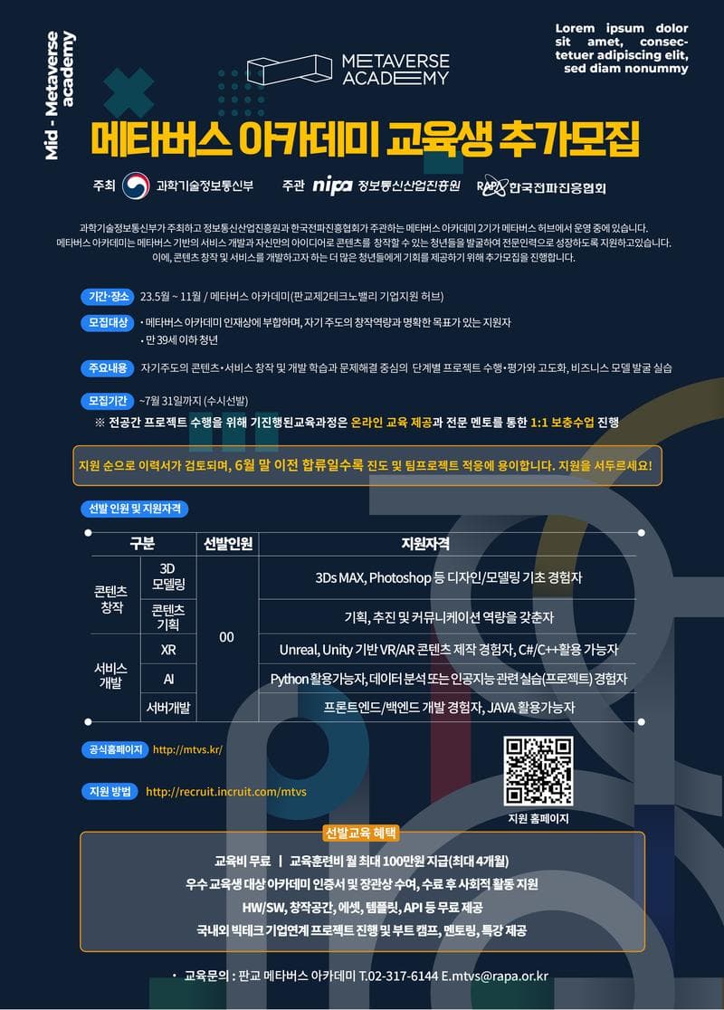 과학기술정보통신부 주최, 한국전파진흥협회 주관 < 메타버스 아카데미 2기 > 추가 모집 중!