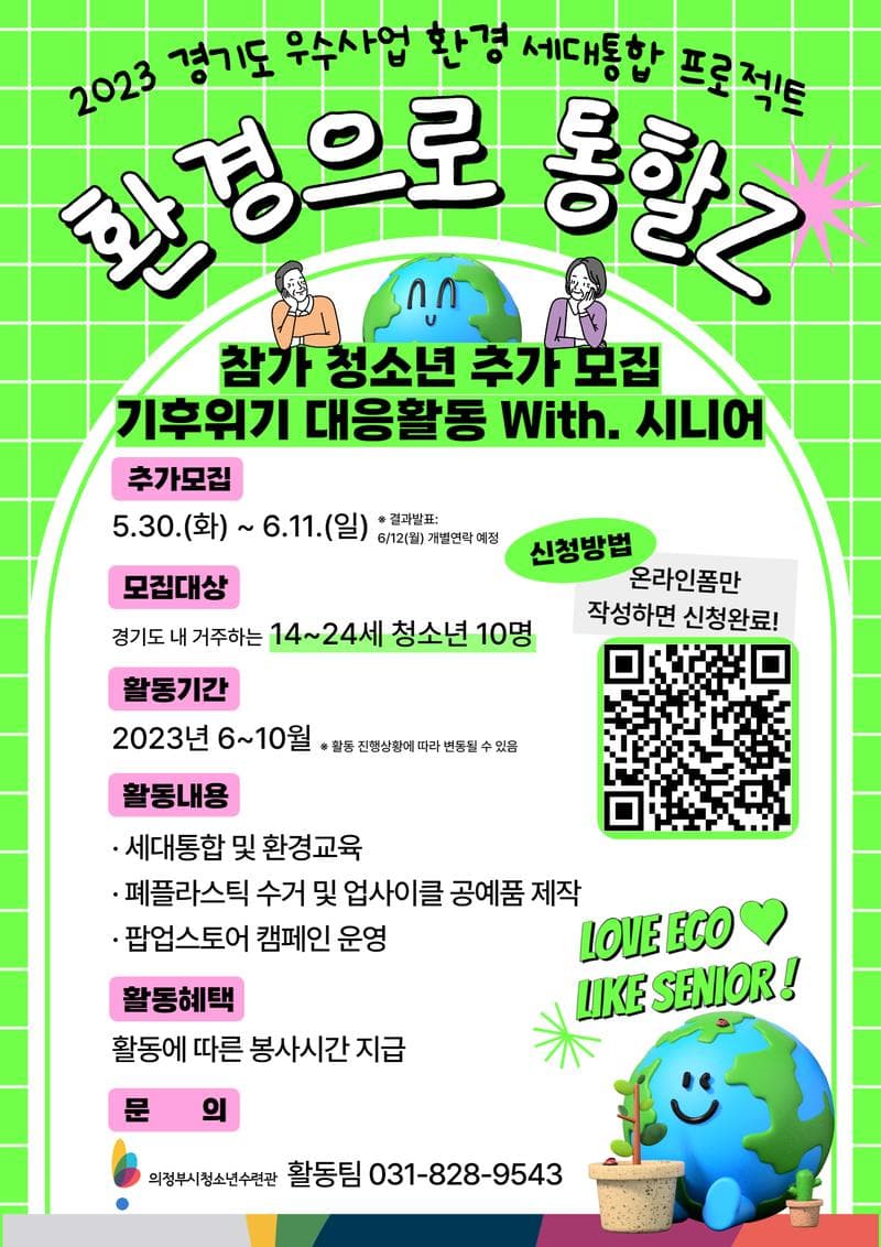 ○ 모집기간: 5/30(화) \~ 6/11(일) ○ 모집대상: 경기도 내 거주하는 14세\~24세 청소년 10명 ○ 활동기간: 2023년 6\~10월 ※ 활동 진행상황에 따라 변동될 수 있음 ○ 활동내용: 세대통합 및 환경교육, 폐플라스틱 수거 및 업사이클 공예품 제작, 팝업스토어 캠페인 기획 및 운영 등 ○ 신청방법: 온라인폼 신청서 작성(https://moaform.com/q/RZXJcY) ○ 활동혜택: 활동에 따른 봉사시간 지급 ○ 문의: 의정부시청소년수련관 활동팀 031-828-9543