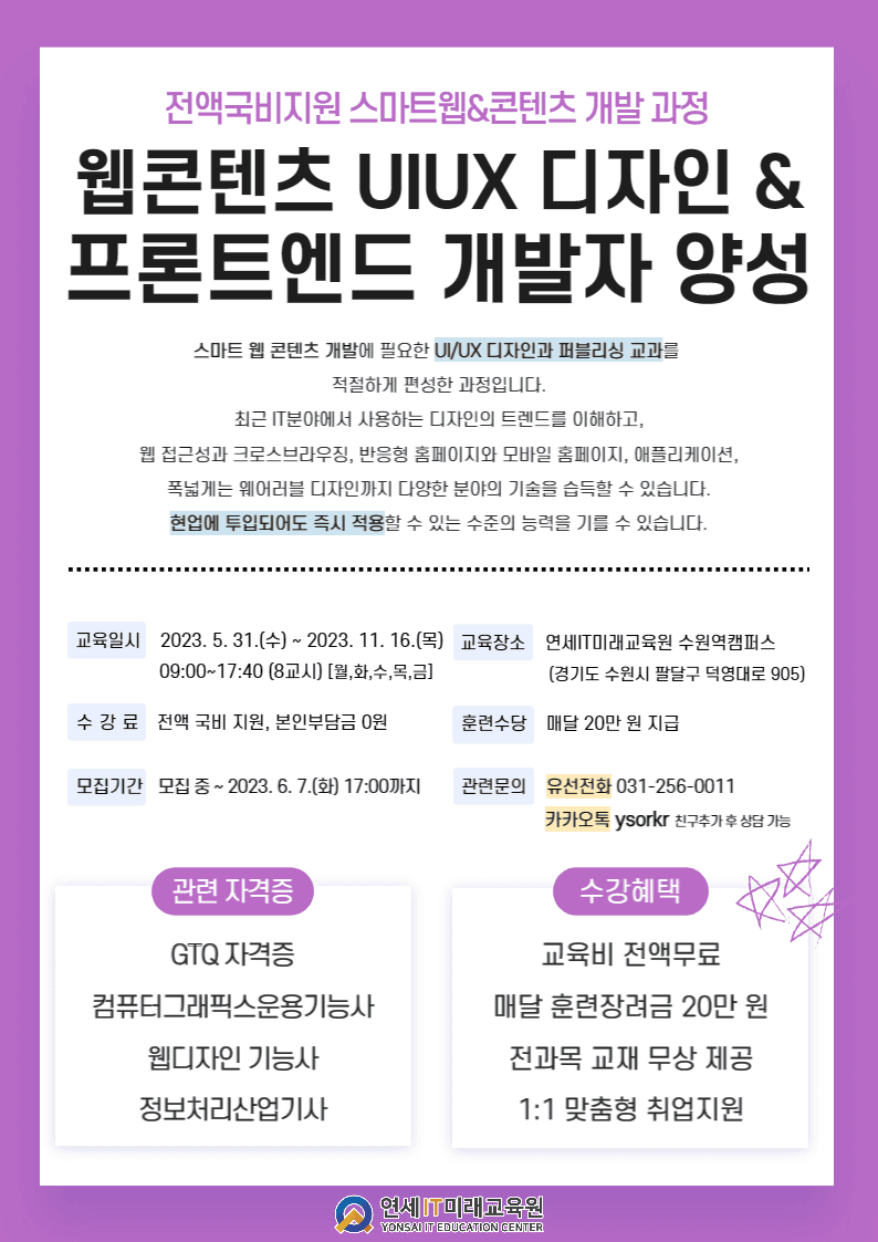 [문의처] 연세IT미래교육원 수원역 캠퍼스(구.연세직업전문학교) 16455 경기도 수원시 팔달구 덕영대로 905, 2층(아이메카빌딩) Tel : 031-256-0011 Fax : 031-256-0099