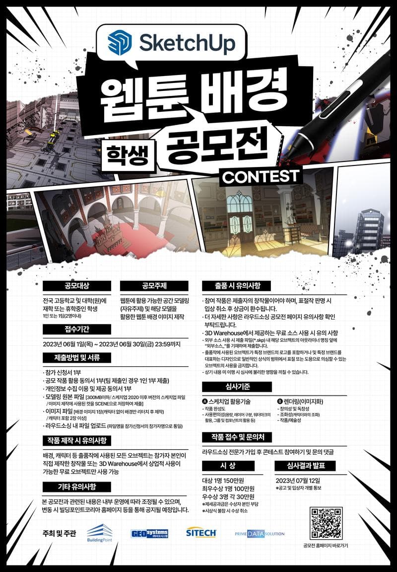 제출 방법 및 서류 - 참가 신청서 1부 - 공모 작품 활용 동의서 1부(팀 제출인 경우 1인 1부 제출) - 개인정보 수집 이용 및 제공 동의서 1부 - 모델링 원본 파일 * 300MB 이하 * 스케치업 2020 이후 버전의 스케치업 파일 * 이미지 제작에 사용된 컷을 SCENE으로 저장하여 제출 - 이미지 파일 * 배경 이미지 1장(캐릭터 없이 배경만 리터치 후 제작) * 캐릭터 포함 2장 이상 - 라우드소싱 내 첨부 파일 업로드 (파일명을 참가자명으로 변경) - 작품 제작 시 유의사항 * 배경, 캐릭터 등 출품작에 사용된 모든 오브젝트는 참가자 본인이 직접 제작한 창작물 또는 3D Warehouse에서 상업적 사용이 가능한 무료 오브젝트만 사용 가능