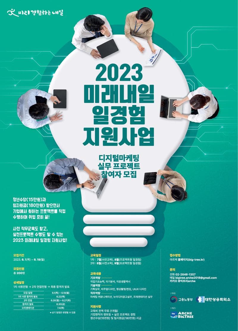 고용노동부 한국산업인력공단 주최로 실시하는 “2023 미래내일 일경험 사업“ 빅트리 아르케가 "디지털마케팅 실무 프로젝트” 참여자를 모집합니다! ★디지털마케팅 실무 프로젝트★ 디지털마케팅 업무를 수행하기 위한 사전교육을 받고 습득된 역량을 실무 프로젝트를 통해 확인해 볼 수 있는 취업역량 강화 프로그램으로 이를 바탕으로 성공적인 취업 준비 완성! ✔교육비 전액 무료 ✔기업 현직자 멘토링 ✔실무 프로젝트 경험 ✔청년수당(개인별 15만원) + 팀지원금(180만원) 지급 👀 자세한 모집 내용 궁금하다면? 하단 링크 참조! ● 모집기간 : 06.01(목) \~ 06.19(월) ● 모집대상 : 만 18세 이상 \~ 만 34세 이하의 청년 미취업자 ● 모집인원 : 200명 ● 활동기간 : (1차) 사전교육 7월, 일경험 8월 : (2차) 사전교육 8월, 일경험 9월 ● 활동장소 : 아르케 문래캠퍼스 올댓마인드(영등포구 문래로55) ● 활동내용 - 기술역량(기획실무, 비주얼디자인, 영상편집 등)&직무역량(마케팅 커뮤니케이션, 프레젠테이션 실무 등) 강의 진행 - 직업진로 교육 (기업현직자 멘토링) - 디지털마케팅 실전 프로젝트 - 온라인 강의 제공 ● 신청서 제출 www.big-tree.kr 경로 : 아르케 프로그램 - 미래내일 일경험 사업 - 신청하기 ● 문의처 전화 02-2646-1357 \| 메일 archejob2023@gmail.com \| 카카오 @빅트리arche 주최 \| 고용노동부, 대한상공회의소 운영 \| ㈜아르케 아르케 블로그 : https://blog.naver.com/bigtreearche 아르케 홈페이지 : www.big-tree.kr