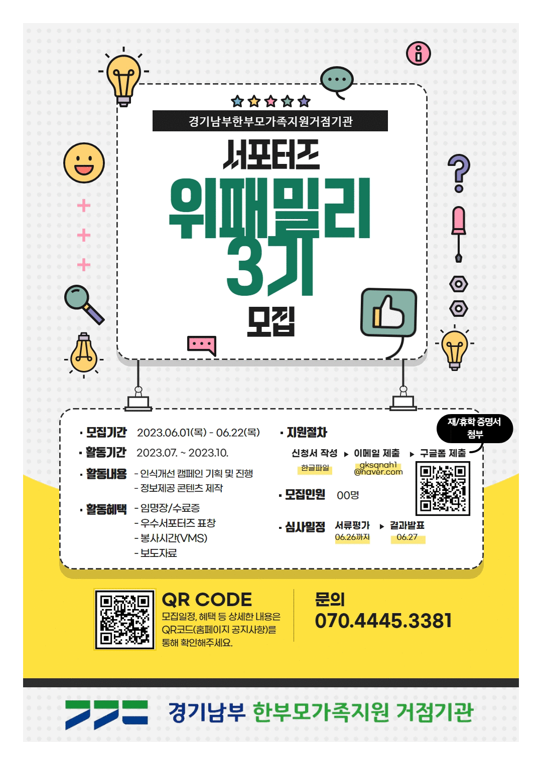 ○ 모집개요 - 경기남부 한부모가족지원 거점기관에서는 한부모가족에 대한 사회적 편견/차별 예방 및 가족의 다양성을 인정하는 평등한 사회적 분위기 조성을 위한 서포터즈 '위패밀리 3기'를 모집합니다!
