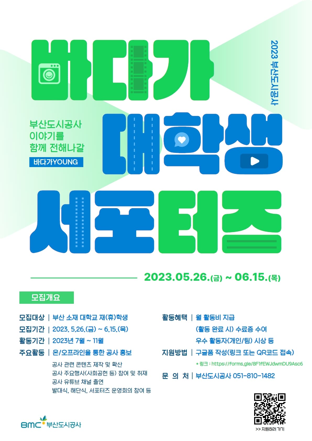 부산의 일상을 만들어가는 부산도시공사의 다양한 이야기를 함께 전해 나갈 대학생 서포터즈(바다가YOUNG) 7기를 모집합니다. 대학생 여러분의 많은 관심과 참여 바랍니다. ■ 모집기간 : 2023. 5.26.(금) \~ 6.15.(목) ■ 모집대상 : 부산 소재 대학교 재(휴)학생 ※ SNS 채널을 활발히 운영하거나 글쓰기, 영상 등 콘텐츠 제작능력을 보유한 대학생 우대 ■ 모집인원 : 10명 ■ 주요활동 : 온/오프라인을 활용한 부산도시공사 홍보 * (개인) 월 1회, (팀) 활동 내 2 \~ 3회 - 공사 관련 홍보 콘텐츠 제작 및 확산 - 공사 주요행사(사회공헌 활동, 유튜브 채널출연 등) 참여 및 취재 등 ■ 활동기간 : 2023. 7월 \~ 11월(5개월) - 발대식 : 2023년 6월 말 또는 7월 초 예정(※ 합격자 발대식 참석 필수) ■ 활동혜택 - 매월 활동비 지급 - 우수 활동자(개인/팀) 시상 - 활동 완료 시 수료증 수여 ■ 지원방법 : 구글폼 작성(링크 또는 QR코드 접속) - 링크 : https://forms.gle/8F1fEWJdwmDU9Asc6 ■ 합격자 발표 : 2023. 6.23.(금) 합격자 개별 연락 예정 ■ 문의 : 부산도시공사 경영지원실 051-810-1482 또는 letitbe48@bmc.busan.kr
