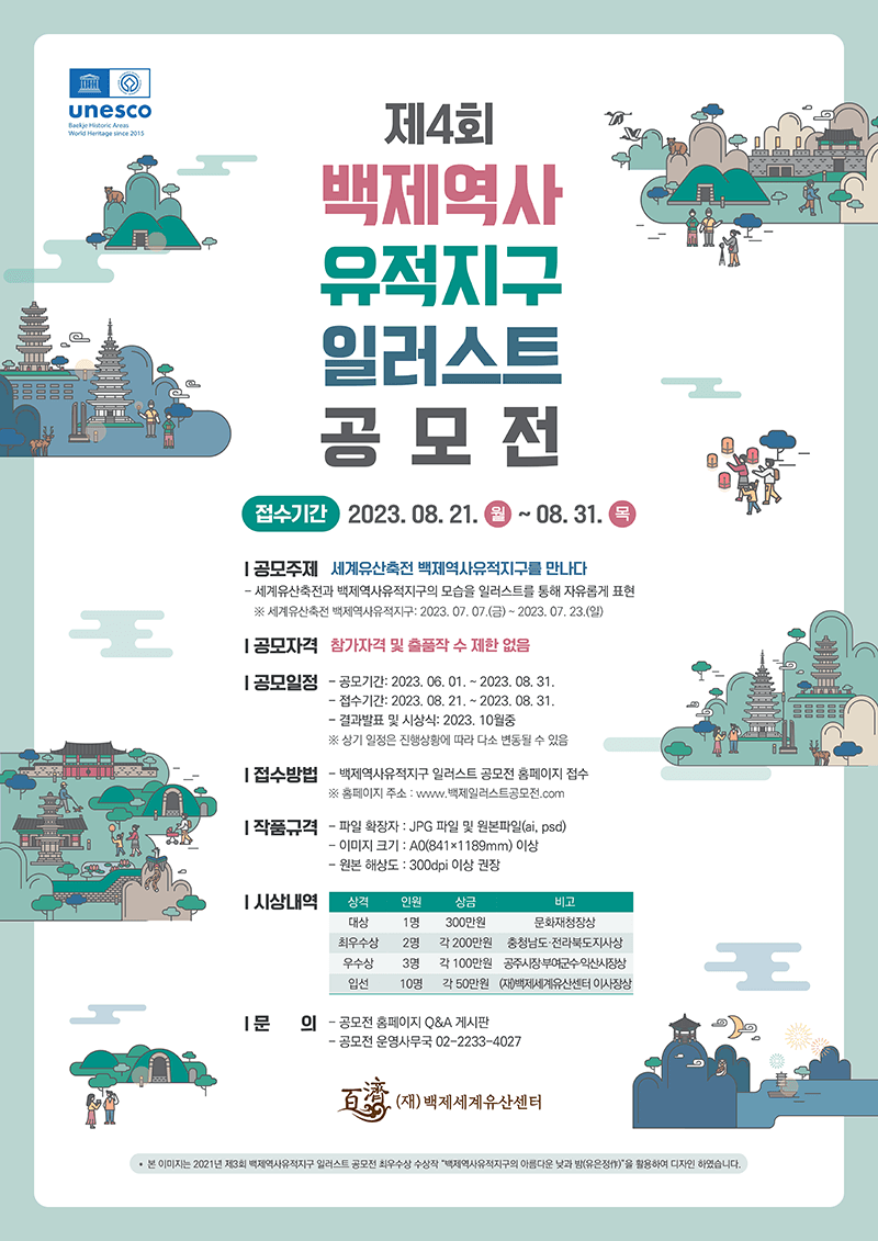 ■ 응모주제 - 세계유산축전 백제역사유적지구를 만나다 - 세계유산축전과 백제역사유적지구의 모습을 일러스트를 통해 자유롭게 표현 ※ 세계유산축전 백제역사유적지구 : 2023.07.07.(금)\~2023.07.23.(일) ■ 응모자격 - 참가자격 및 출품작 수 제한 없음 ■ 시상내역 - 총 상금 1\,500만원 및 상장 - 대상(1) : 상금 300만원 및 문화재청장상 - 최우수상(2) : 각 상금 200만원 및 충청남도·전라북도지사상 - 우수상(3) : 각 상금 100만원 및 공주시장·부여군수·익산시장상 - 입선(10) : 각 50만원 및 (재)백제세계유산센터 이사장상 ■ 응모일정 - 공모기간 : 2023.06.01.\~2023.08.31. - 접수기간 : 2023.08.21.\~2023.08.31. - 결과발표 및 시상식 : 2023년 10월중. ※ 상기일정은 진행상황에 따라 다소 변동될 수 있음 ■ 접수방법 - 백제역사유적지구 일러스트 공모전 홈페이지 접수 ※ 홈페이지 주소 : www.백제일러스트공모전.com ■ 작품규격 - 파일 확장자 : JPG 파일 및 원본파일(ai\, psd) - 이미지 크기 : A0(841×1189mm) 이상 - 원본 해상도 : 300dpi 이상 권장 ■ 문의처 - 공모전 홈페이지 Q&A 게시판 - 공모전 운영사무국 02-2233-4027