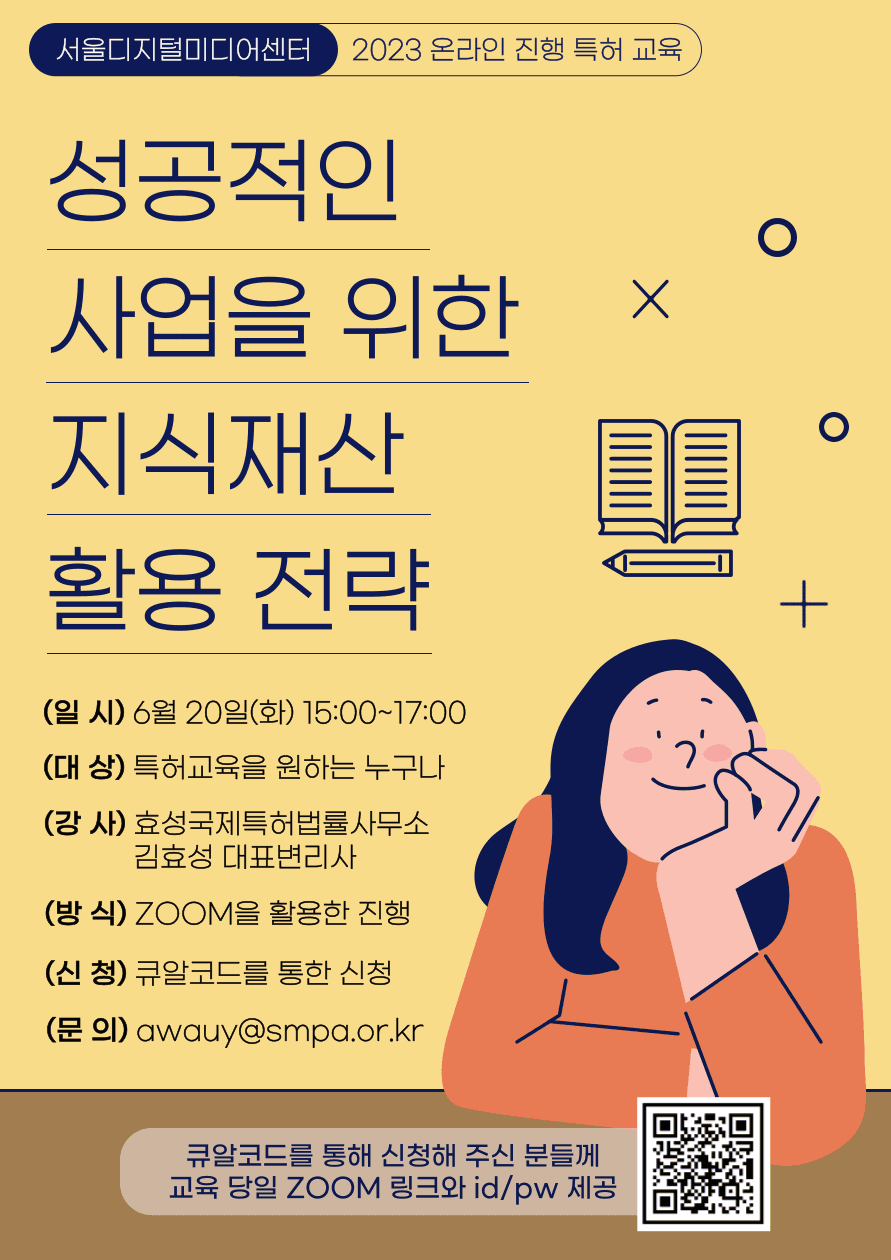 □ 교육 개요 o 일 시 : 2023년 6월 20일(화) 15:00∼17:00 (2시간) o 대 상 : 서울디지털미디어센터 입주·졸업기업, 서울권 1인 창조기업 지원센터 입주·졸업기업, 1인 창조기업 정회원 등 o 과 정 : 성공적인 사업을 위한 지식재산 활용 전략 o 강 사 : 효성국제특허법률사무소 김효성 대표변리사 o 운영방식 : 온라인 강의 플랫폼(ZOOM)을 활용하여 교육 진행 □ 신청 방법 o 포스터 하단의 큐알코드를 통해 신청 □ 문의처 o 전화 : 02-3151-0750 o 이메일 : awauy@smpa.or.kr 실무를 알기에 좋은 기회이니 많은 분들의 지원을 부탁드립니다.
