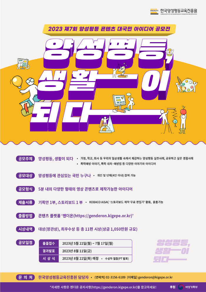 - 「2023 제7회 양성평등 콘텐츠 대국민 아이디어 공모전」개최 안내 - '양성평등, 생활이 되다' 국민이 일상생활에서 직접 경험하고 체감한 다양한 양성평등 및 폭력예방 실천사례에 기반한 다양한 아이디어 발굴로 양성평등 및 폭력예방에 대한 사회적 공감대 제고와 이를 통한 긍정적 인식 확산을 도모하고자 한국양성평등교육진흥원에서는 2023 제7회 양성평등 콘텐츠 대국민 아이디어 공모전을 개최합니다. ■ 주제 : 양성평등, 생활이 되다 - 가정, 학교, 회사 등 우리의 일상생활 속에서 체감하는 양성평등 실천사례, 공유하고 싶은 경험사례 - 폭력예방 이야기, 폭력 대처·예방법 등 다양한 이야기와 아이디어 ■ 대상 : 양성평등에 관심 있는 국민 누구나 (개인 및 단체 4인 이내) ■ 부문 : 5분 내의 다양한 형태의 영상 콘텐츠로 제작 가능한 아이디어 - 기획안 1부, 스토리보드 1부 ■ 참여방법 : 젠더온(genderon.kigepe.or.kr)에서 출품접수 ■ 출품기간 : 2023년 5월 22일(월) \~ 7월 17일(월) ■ 수상발표 : 2023년 8월 11일(금) * 젠더온 게재 및 개별 통지(예정) ■ 시상식 : 2023년 8월 22일(화) * 수상자 필참(PT발표) ■ 시상 : 총 11편 선정, 상금 1,050만원 규모 * 출품분야 및 건수에 따라 시상내역 변동 가능 ■ 문의 : 한국양성평등교육진흥원 공모전 담당자 (02-3156-6189 / genderon@kigepe.or.kr)