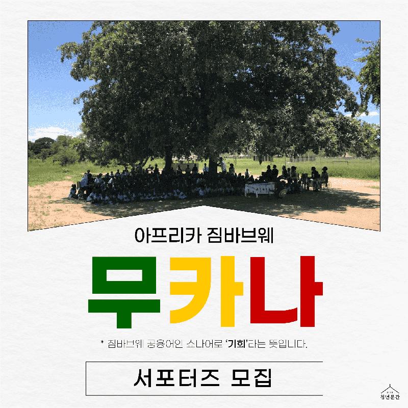 청년문간은 아프리카 짐바브웨 지역 주민과 청년들에게 무카나[기회]를 선물하는 프로젝트를 준비하였습니다. 무카나 프로젝트에 함께 할 열정 가득한 청년 서포터즈를 모집합니다. [아프리카 짐바브웨] 짐바브웨에는 세계적으로 유명한 빅토리아 폭포가 있습니다. 하지만 짐바브웨에서 태어나고 자란 대다수의 현지 주민들은 경제적인 이유로 평생 단 한 번도 빅토리아 폭포를 가보지 못한다고 합니다. 특히 짐바브웨에서도 내륙 깊숙이 위치한 고퀘 지역은 다른 지역들 보다 더 열악한 경제적 상황을 가지고 있습니다. 하루 두 끼, 옥수수죽으로만 배고픔을 해결하며 살아가는 고퀘지역 주민과 청년들에게 청년문간은 삶의 희망을 만들어 갈 수 있는 기회를 선물하고자 합니다.