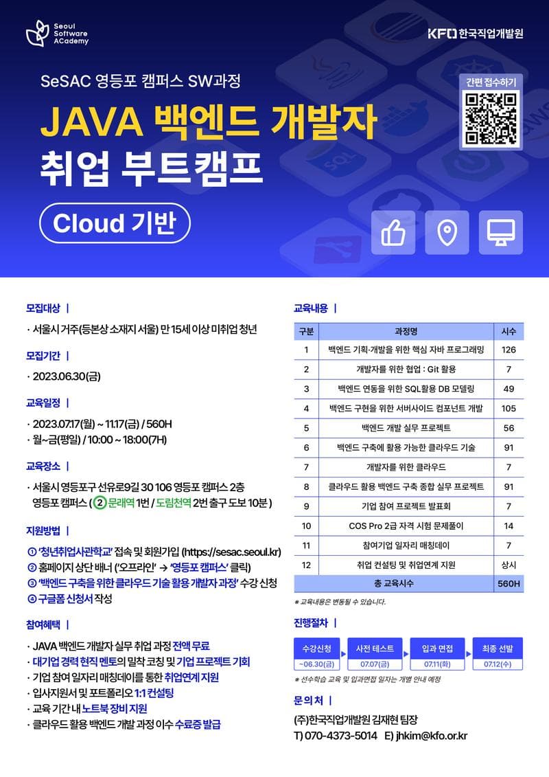 ■ 프로그램 -백엔드 기획·개발을 위한 핵심 자바 프로그래밍 -개발자를 위한 Git활용 -벡엔드 연동을 위한 SQL활용 DB 모델링 -백엔드 구현을 위한 서버사이드 컴포넌트 개발 -백엔드 개발 미니 프로젝트 -백엔드 구축에 활용 가능한 클라우드 기술 -클라우드 활용 백엔드 구축 종합 프로젝트 -프로젝트 발표회 및 기업 담당자 피드백