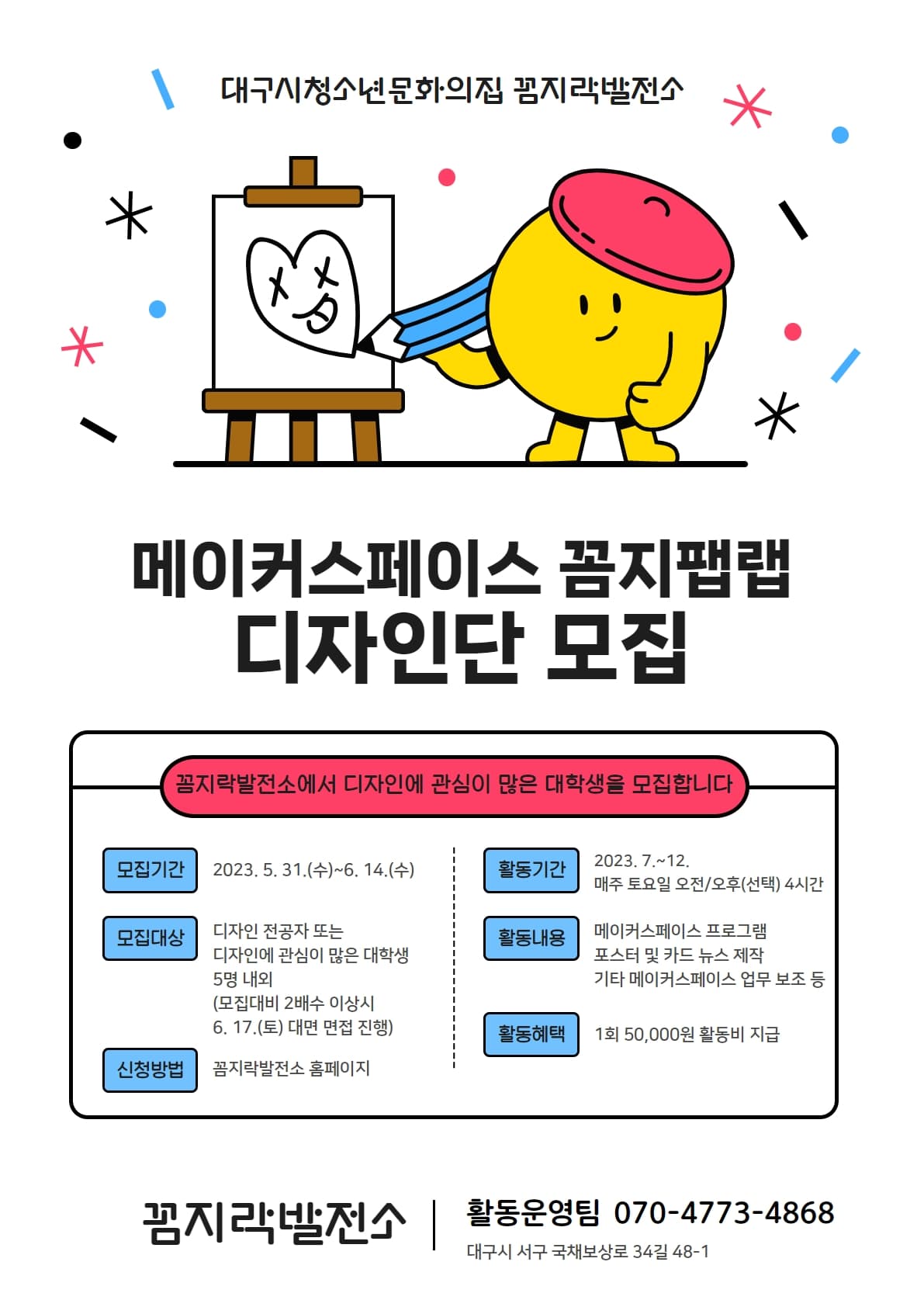 ✔ 모집대상: 디자인 전공자 또는 디자인에 관심이 많은 대학생 5명 내외 ✔ 모집기간: 2023. 5. 31.(수)\~6. 14.(수) ✔ 활동기간: 2023. 7.\~12. (매주 토요일 오전/오후 중 선택, 4시간 활동 예정) ✔ 지원방법: 꼼지락발전소 홈페이지 신청(www.kkomjirak.com) ✔ 결과발표: 지원서를 통한 서류 심사 후 최종 합격자 개별 통보 (참가자 모집이 많을 시, 6/17(토) 대면 면접 진행 예정) ✔ 활동내용: 메이커스페이스 프로그램 포스터 및 카드뉴스 제작, 기타 메이커스페이스 업무 보조 등 ✔ 활동혜택: 1회 활동시 50,000원 활동비 지급 ✔ 문의전화: 꼼지락발전소 활동운영팀 070-4773-4868