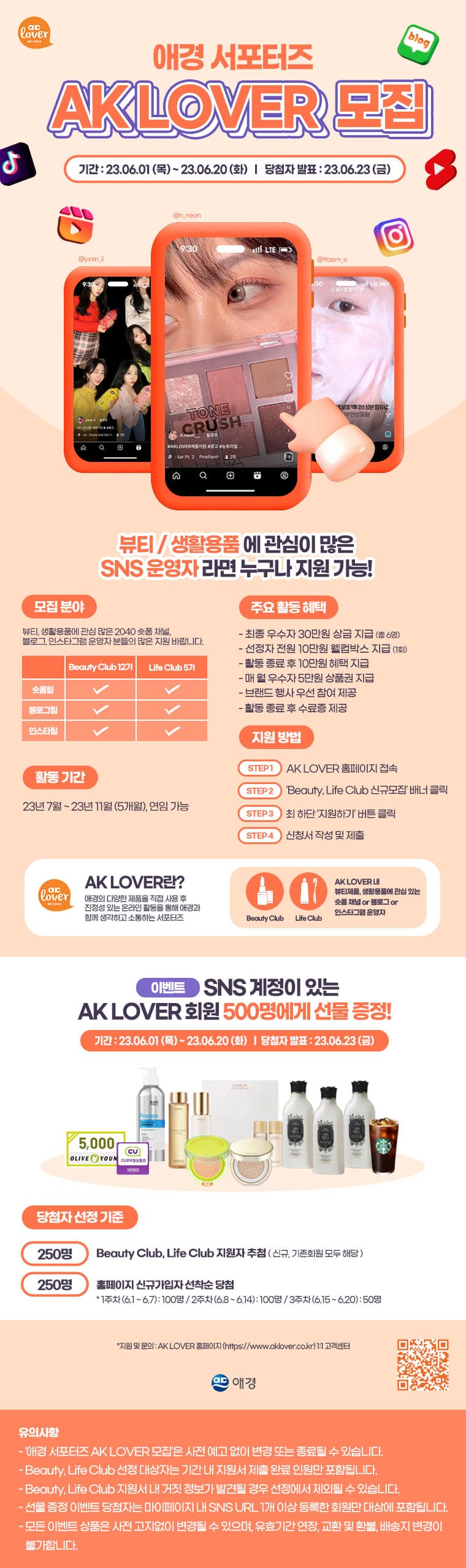 ★ 애경 서포터즈 AK LOVER 모집 * Beauty Club 11기, Life Club 5기 모집 중! ※ Beauty Club, Life Club 이란? : AK LOVER 內 뷰티/ 생활용품에 관심있는 숏폼채널/블로그/인스타그램 운영자 * 주요 활동 혜택 : 최종 우수자 30만원 상금 지급 (총 6명) 선정자 전원 10만원 웰컴박스 지급 (1회) 활동 종료 후 10만원 혜택 지급 매 월 우수자 5만원 상품권 지급 브랜드 행사 우선 참여 제공 활동 종료 후 수료증 제공 ★ SNS 계정이 있는 AK LOVER 회원 500명 선물 증정 이벤트! * 당첨자 선정 기준 - Beauty Club, Life Club 지원자 中 추첨 (250명) - 홈페이지 신규 가입자 선착순 당첨 (250명) ▶ 1주차 (6.1\~6.7): 100명 ▶ 2주차 (6.8\~6.14): 100명 ▶ 3주차 (6.15\~6.20): 500명